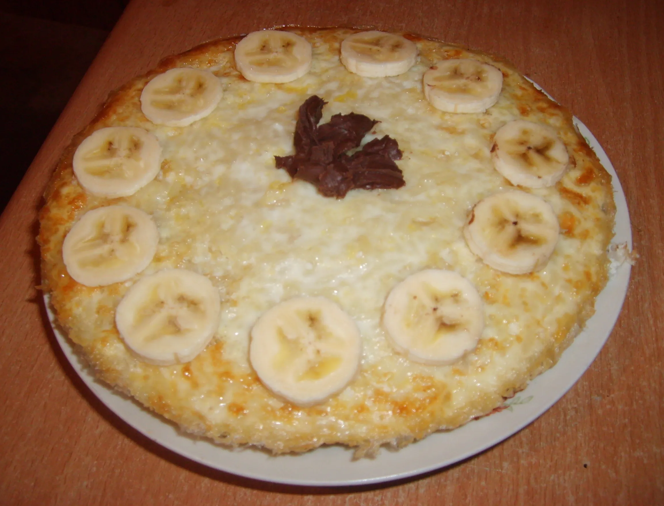 Выложите готовую запеканку на плоское блюдо. Чтобы сделать её более привлекательной для детей, украсьте кусочками банана и шоколадом.