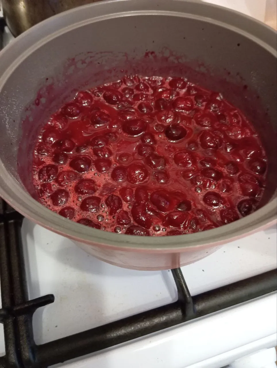 Для вишнёвого конфи поставьте на огонь вишню, сахар и крахмал. Варите 5 минут.