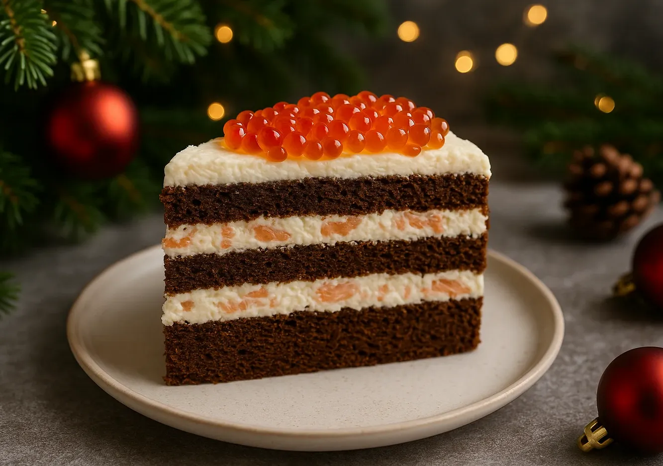 Украсьте торт красной икрой. Готовый торт отправьте в холодильник на пару часов, перед подачей к столу нарежьте на кусочки острым ножом.