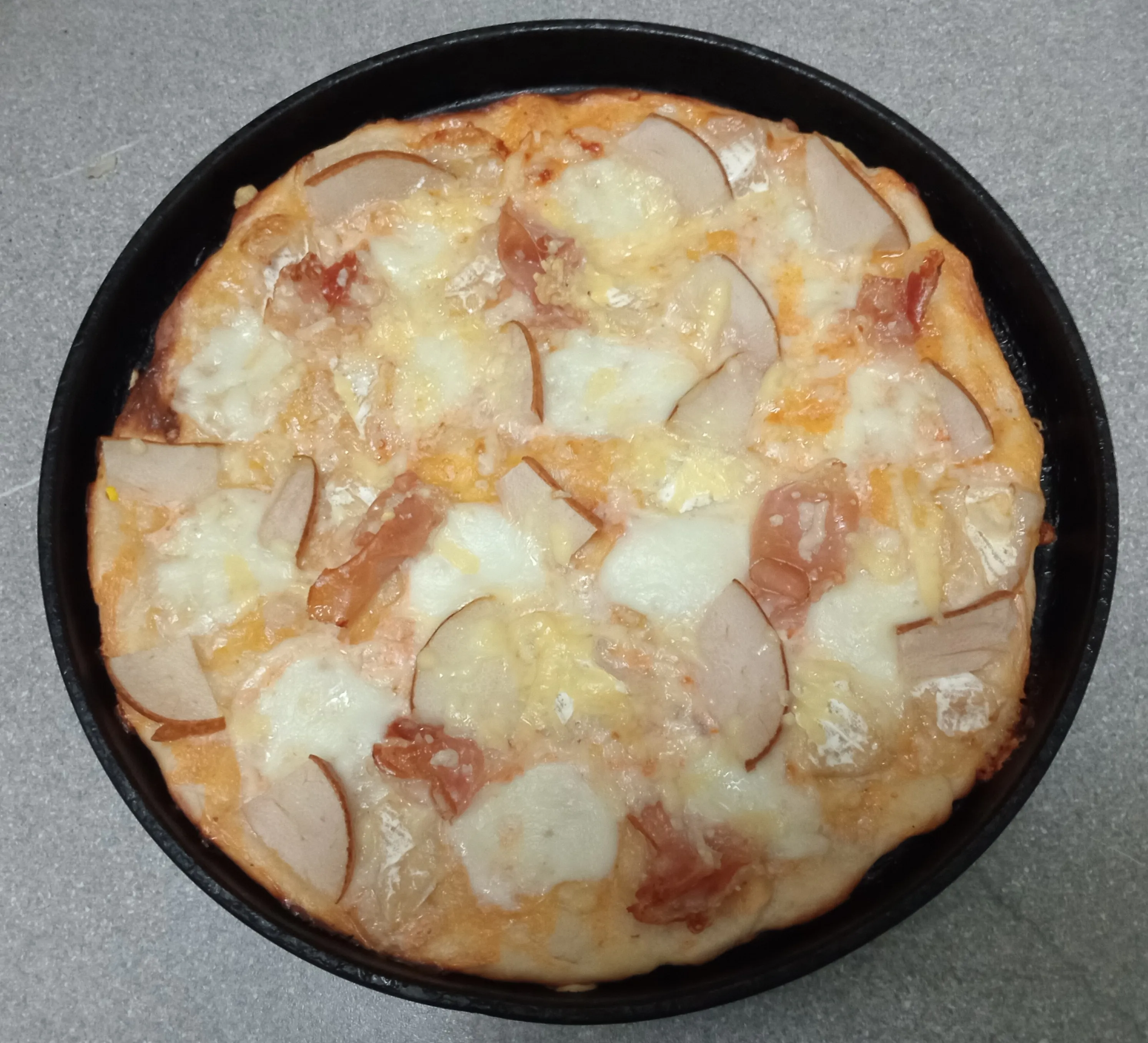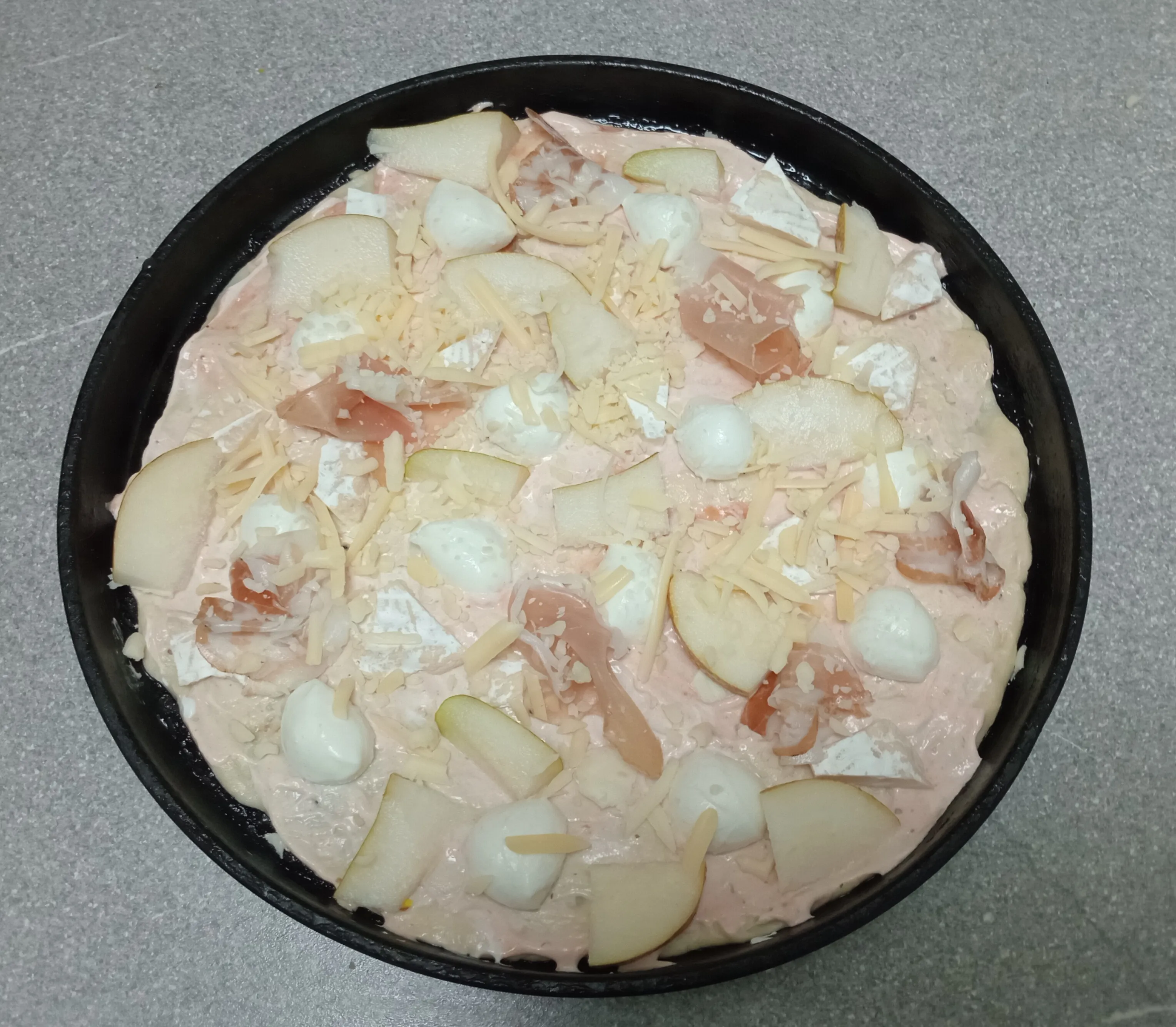 Подготовьте ингредитенты: помойте и нарежьте грушу, натрите твёрдый сыр на тёрке. Порежьте Бри. Тесто тонко раскатайте и выложите в форму для пиццы.