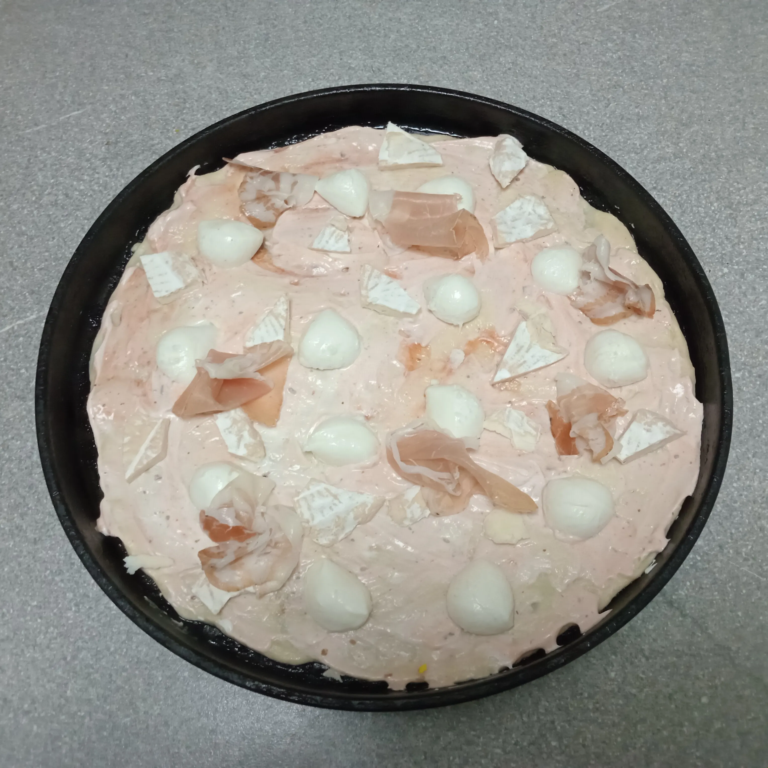 Выложите сверху сырокопчёный бекон, Моцареллу и нарезанный сыр Бри.