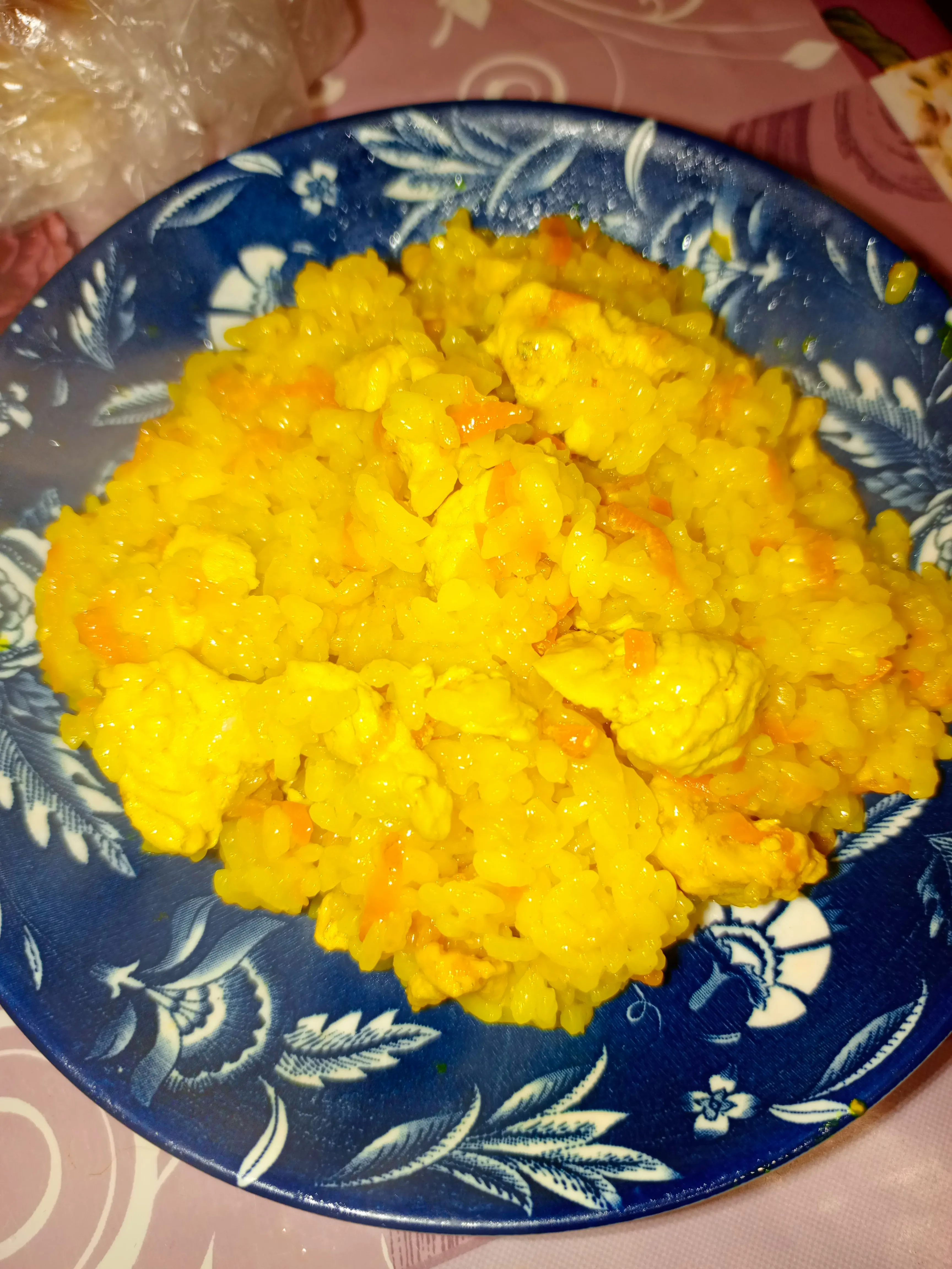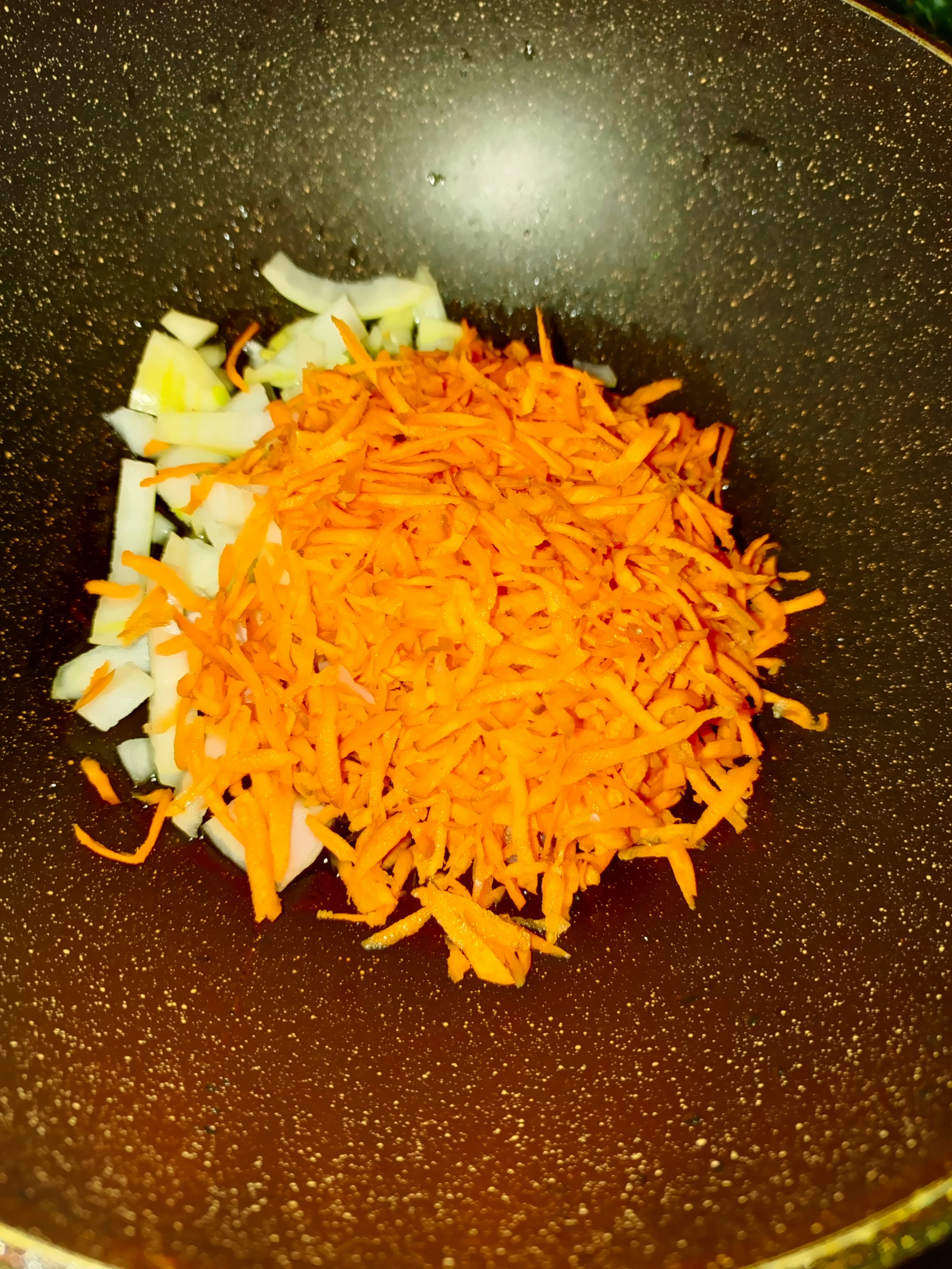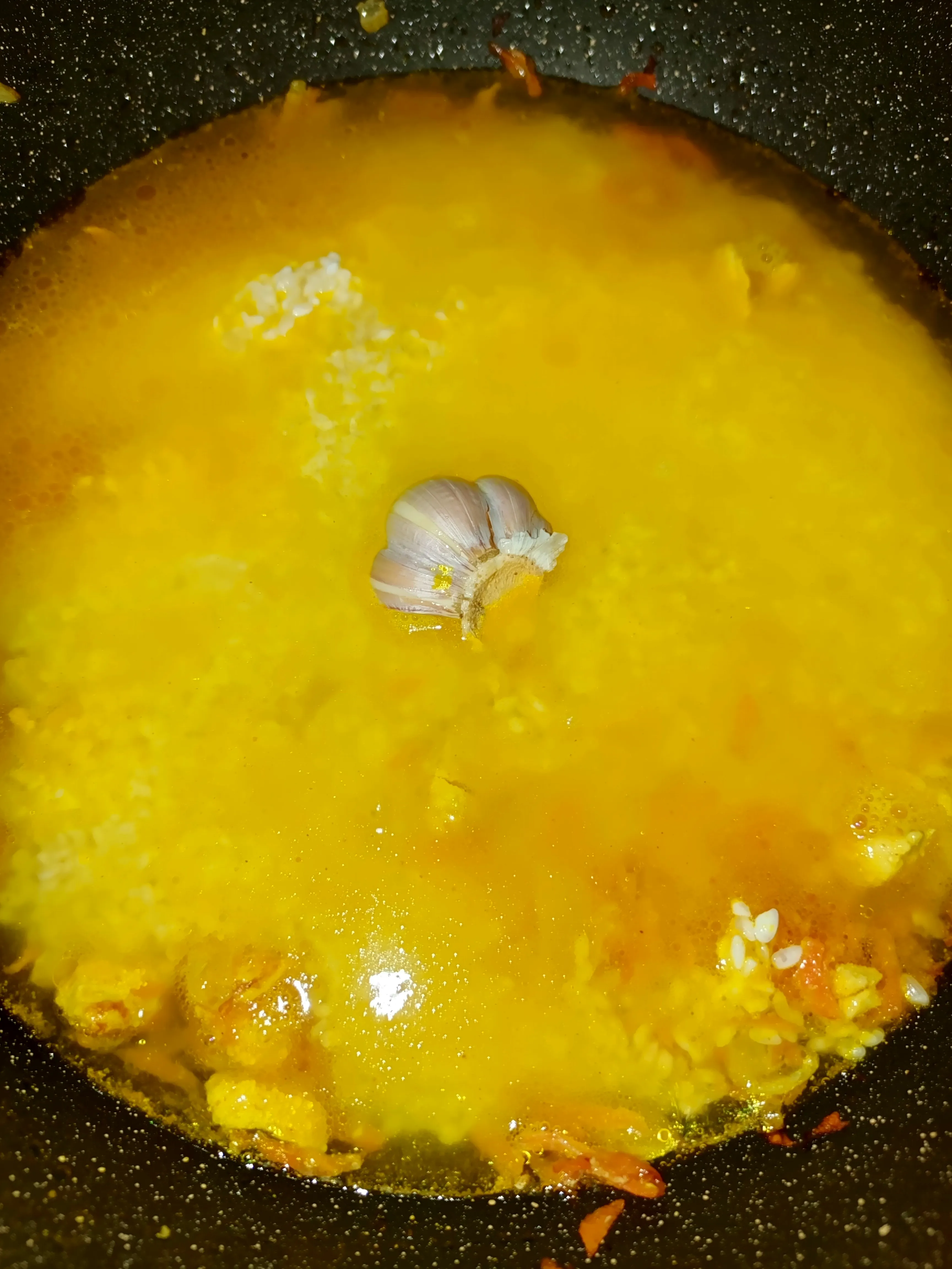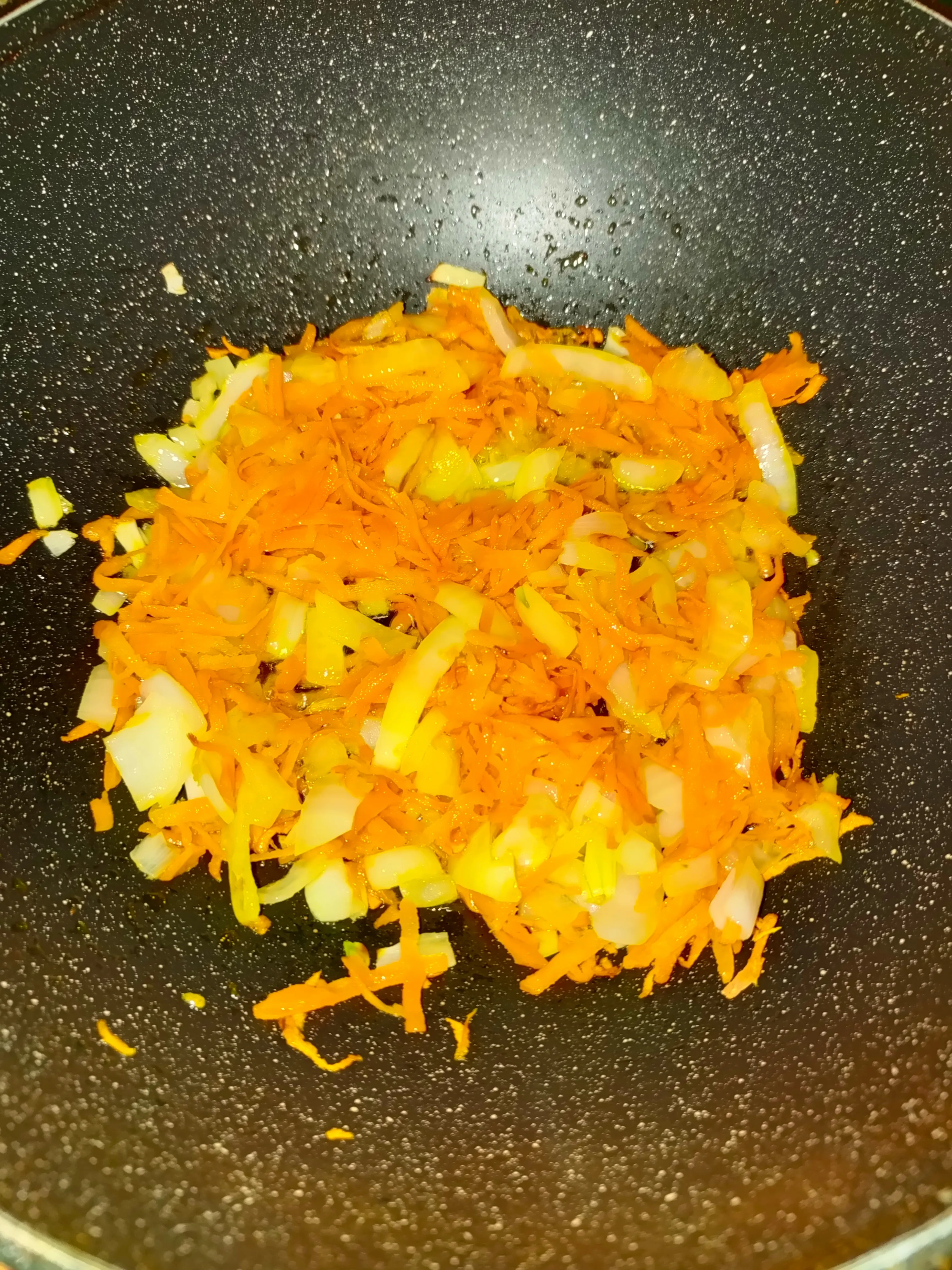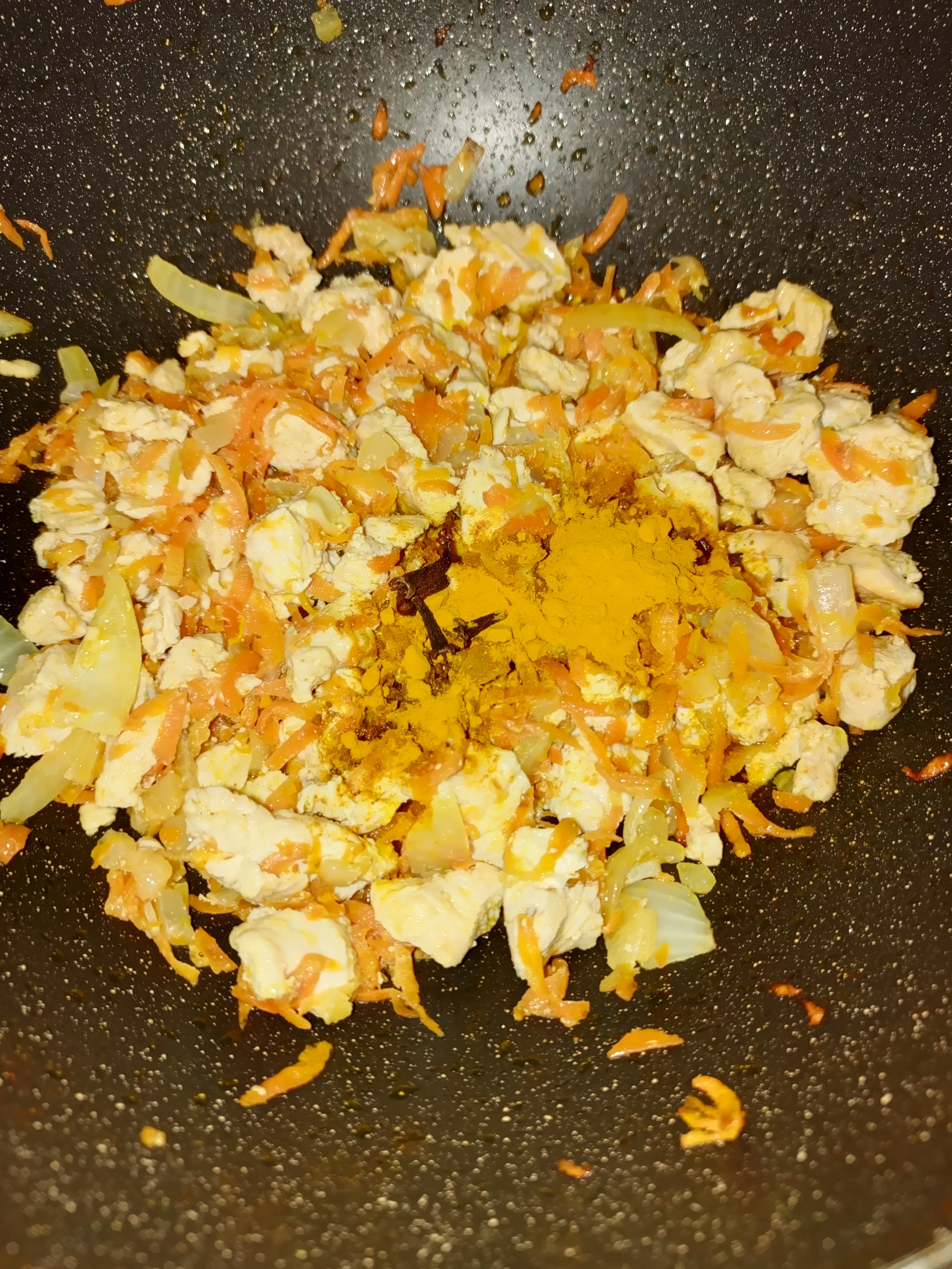 Добавьте в сковороду куркуму, соль, гвоздику. Всыпьте рис.