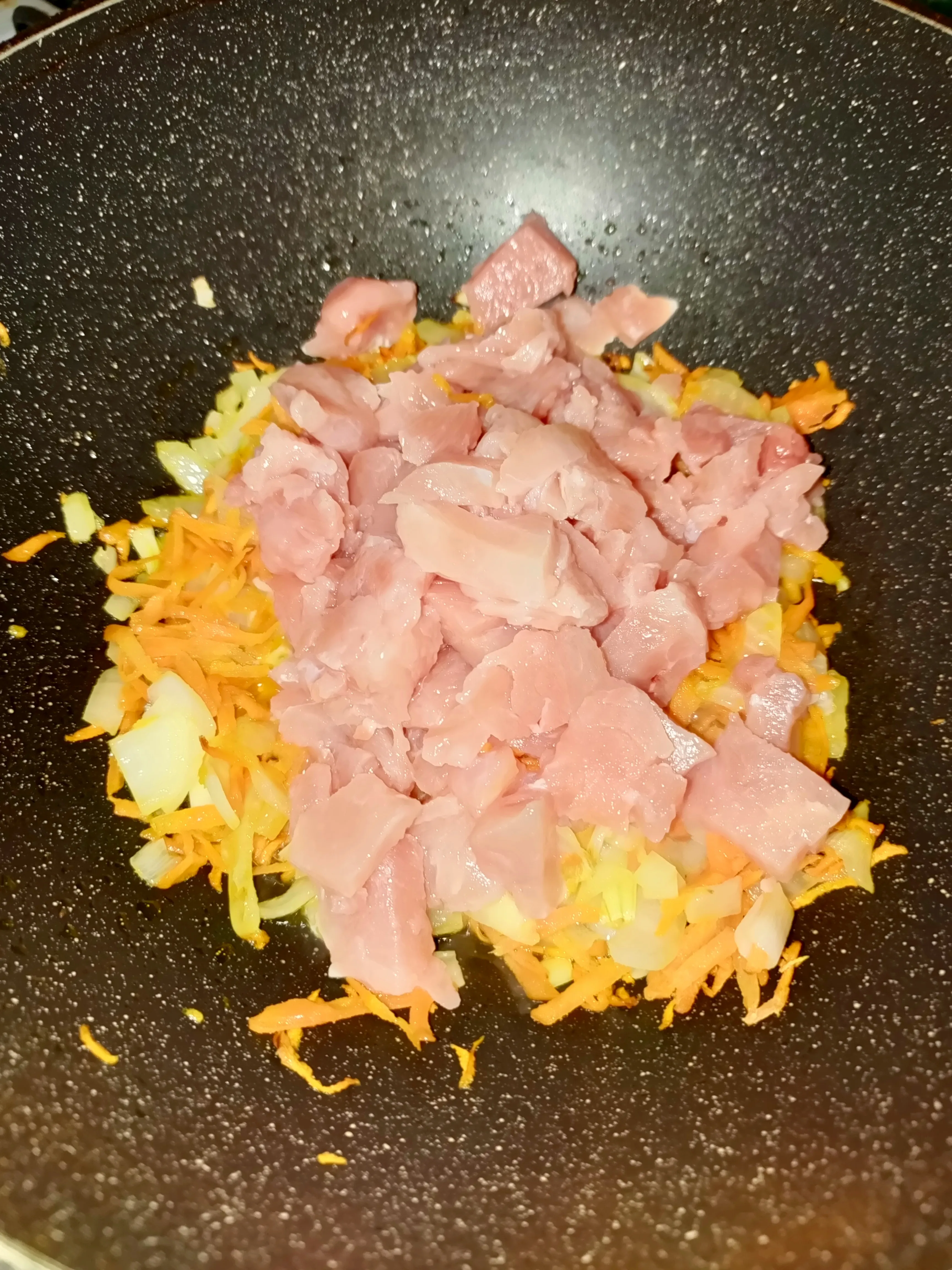 Добавьте нарезанную куриную грудку. Всё обжарьте ещё 5 минут.