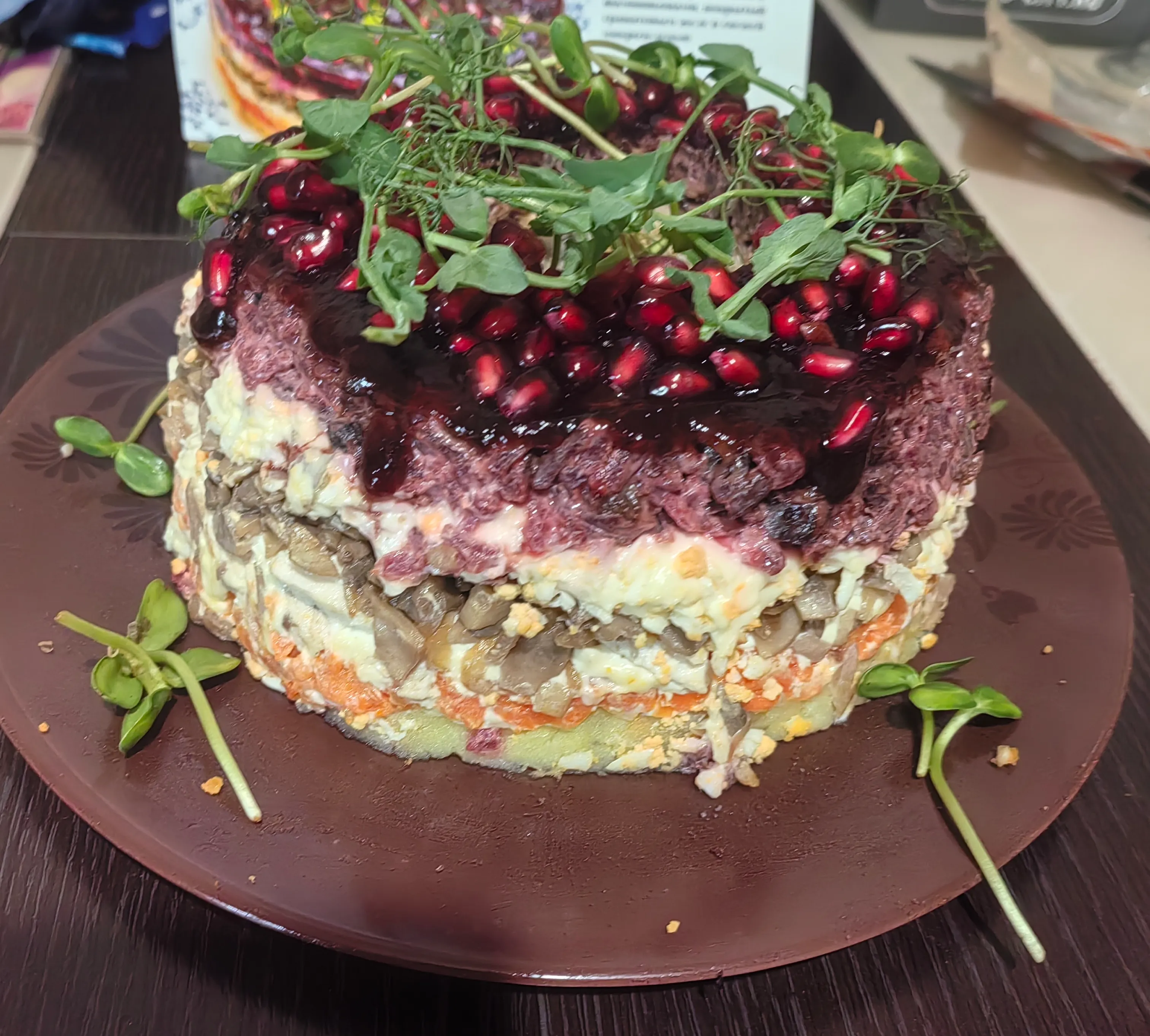 В центр блюда поставьте стакан, вокруг него выложите слоями: картофель, майонез, морковь, майонез, курицу, майонез, яйца, майонез, свёклу, майонез.