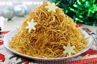 Новогодний салат «Стог сена» — яркое и эффектное блюдо, которое станет настоящим украшением праздничного стола. Объёмная форма стога, золотистые хрустящие полоски картофеля и сочная начинка создают впечатляющий контраст текстур и вкусов. Салат сочетает нежное мясо, свежие овощи, сыр и яйца, а лёгкая сладость яблока делает вкус более свежим и выразительным.
