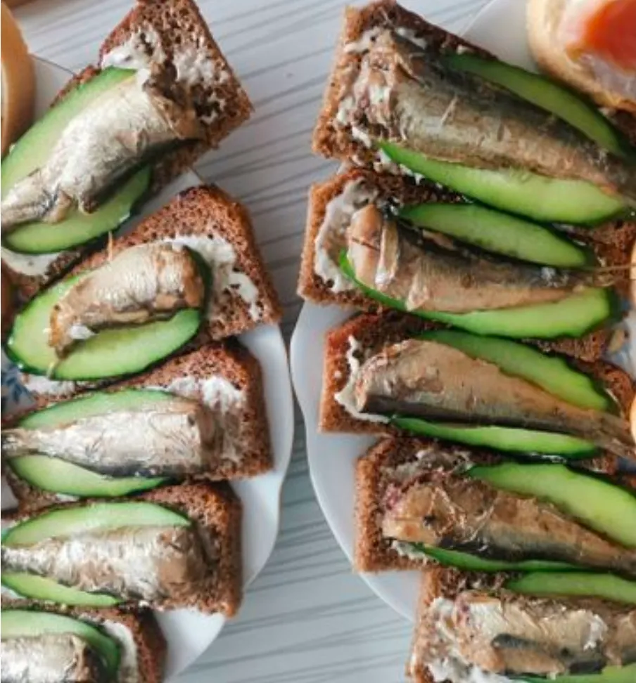Откройте банку шпрот. Одну-две рыбки выложите на хлеб рядом с огурцом.