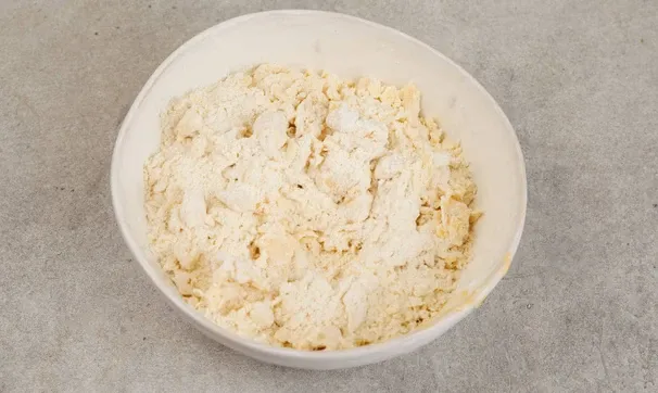Всыпьте муку и быстро замесите тесто лопаткой. Долго такое тесто месить нельзя, иначе печенье не получится нежным и рассыпчатым.