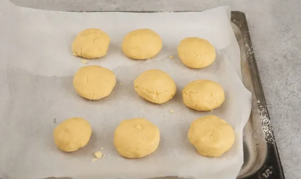Сформируйте шарики из теста, вкладывая в центр по ореху. Выложите шарики на застеленный пергаментом противень и поставьте в разогретую до 200°C духовку на 15 минут.