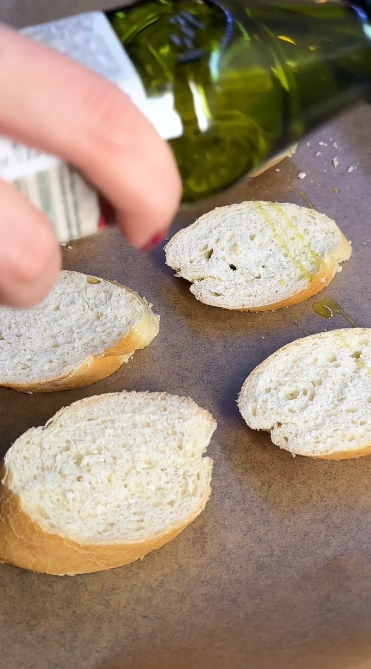 Нарежьте багет на ломтики. Разогрейте духовку до 180°C. Выложите ломтики багета на противень и слегка сбрызните оливковым маслом. Подсушите багет в духовке в течение 5-7 минут, пока он не станет хрустящим.