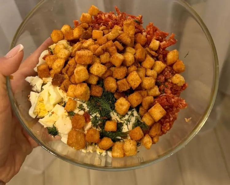 Чтобы сухари не размякли, добавьте их перед подачей. В салате вкуснее будут сухарики со вкусом бекона.