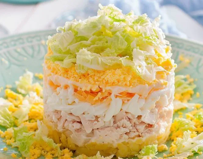 Выложить салат слоями по очереди: картофель, куриное филе, яйцо, сыр и сверху пекинскую капусту. Все слои смазывайте майонезом.