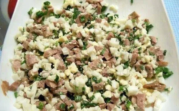 Порежьте мелко зелёный лук. Всё смешайте и заправьте маслом из банки. Блюдо готово.