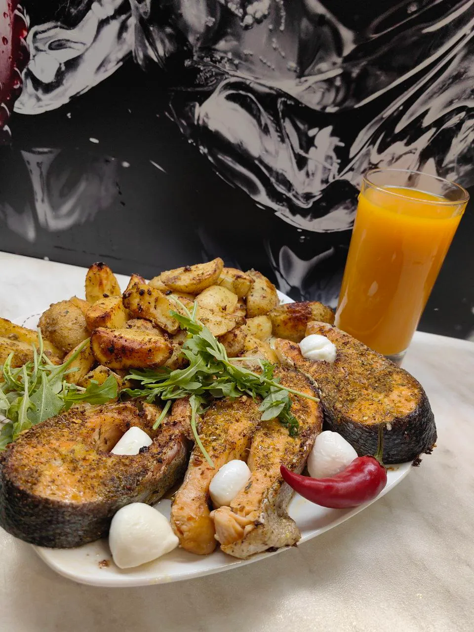 Отправьте всё в духовку на полчаса. Потом картофель смажьте маслом и уберите в духовку ещё на 10 минут (включите конвекцию, чтобы она хорошо зажарилась). Блюдо украсьте по вкусу. Приятного аппетита!