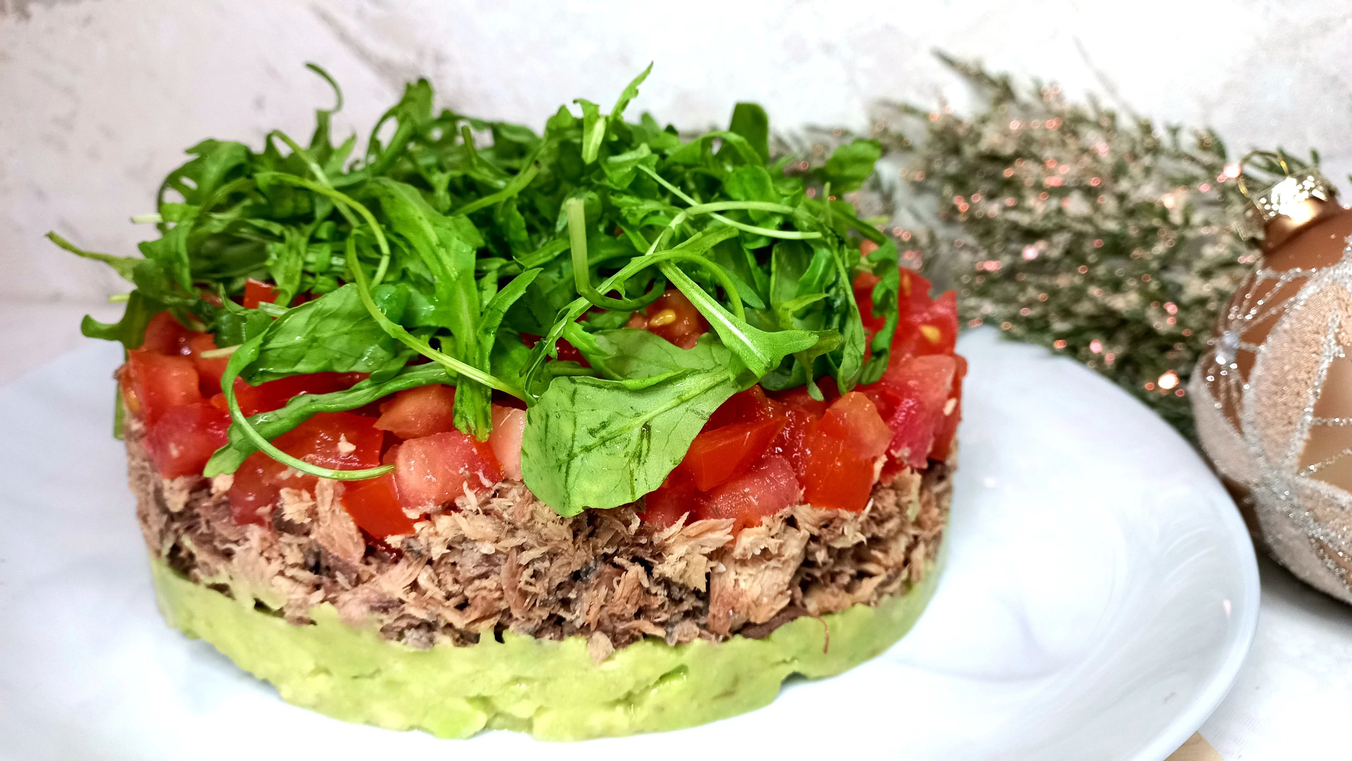 Помидоры нарежьте небольшими кубиками. При помощи металлического кольца выложите слои салата: авокадо, тунец и помидоры. Ингредиенты сильно не прижимайте друг к другу. Снимите кольцо и украсьте пряной руколой. Приятного аппетита!