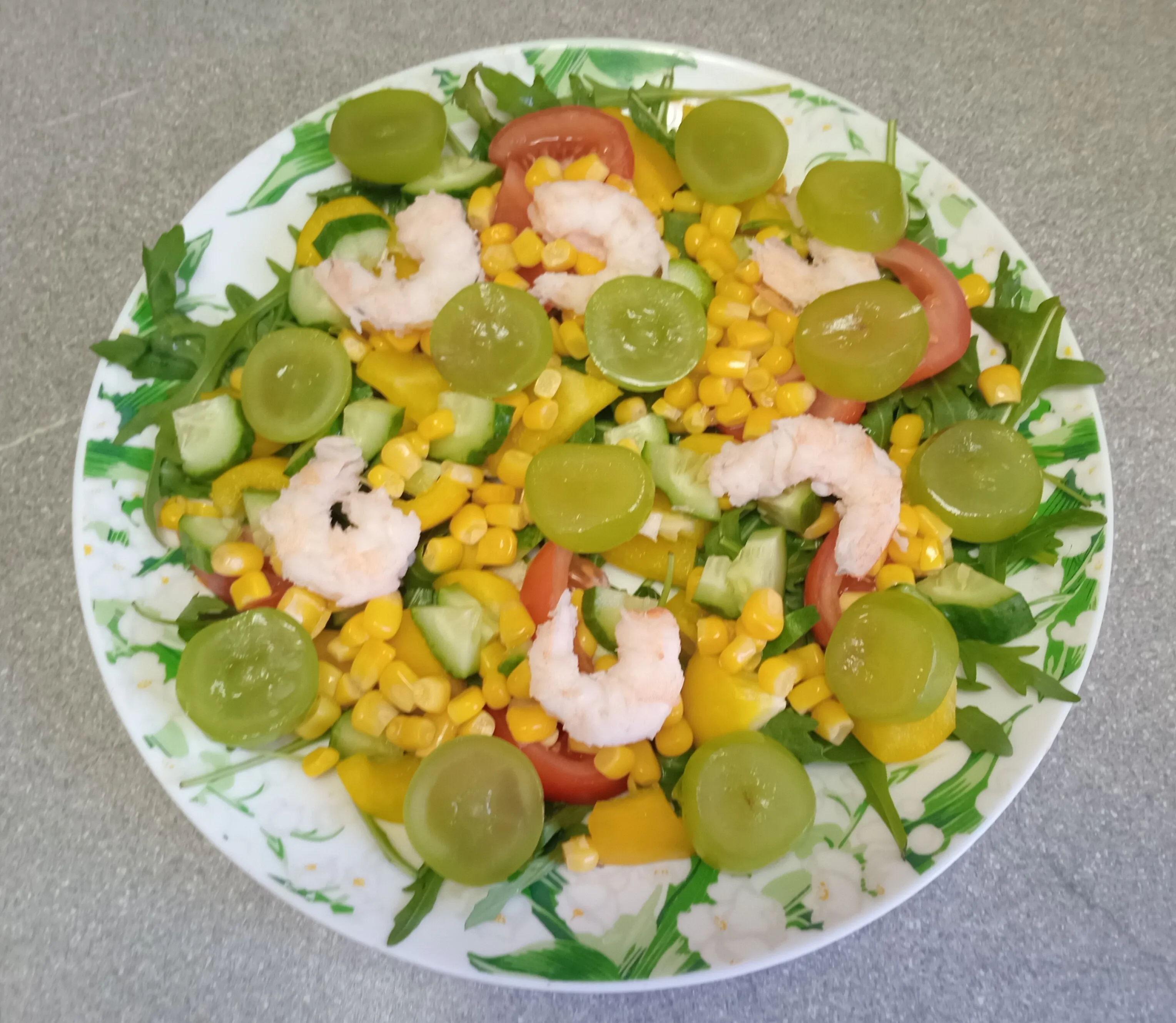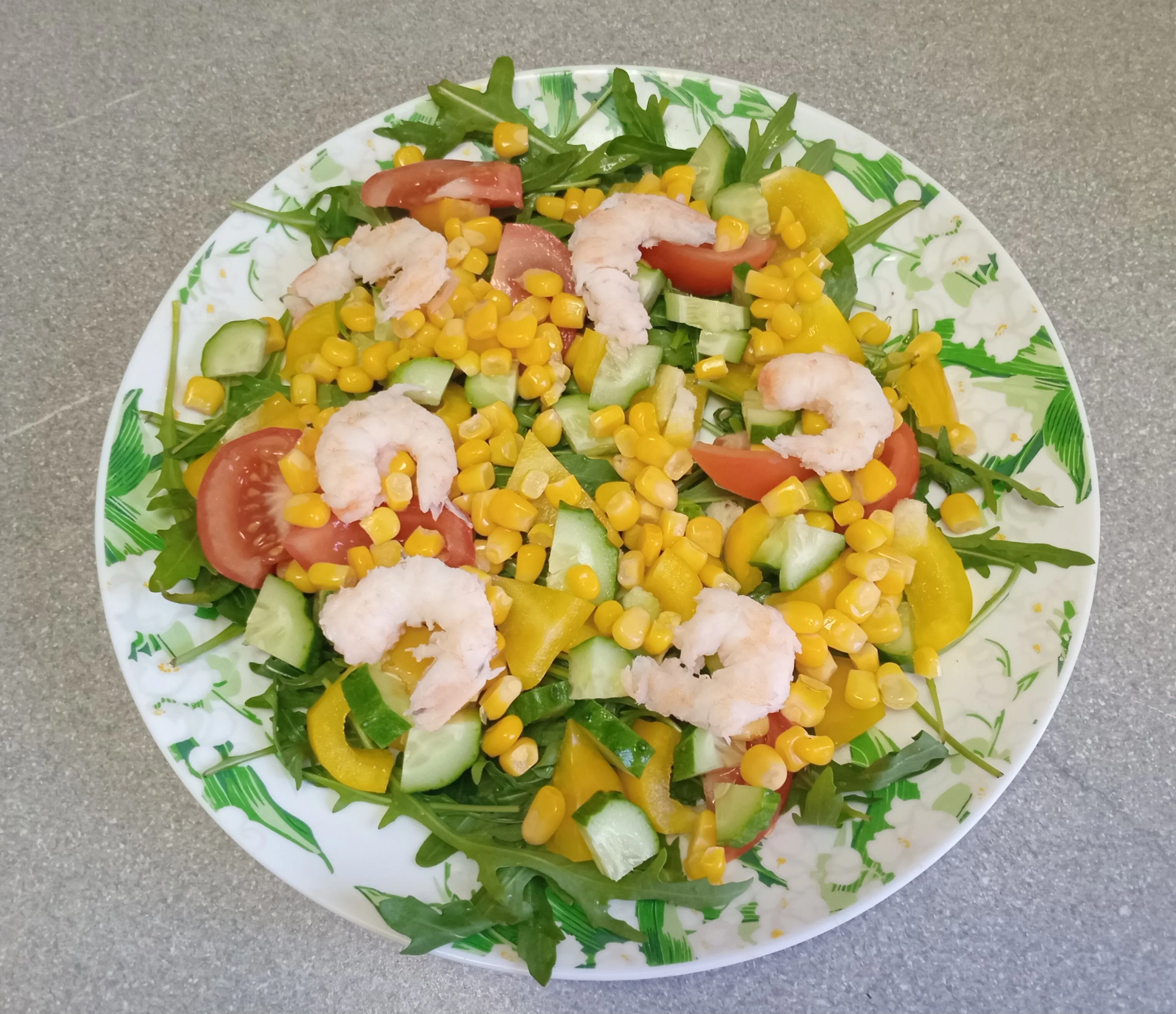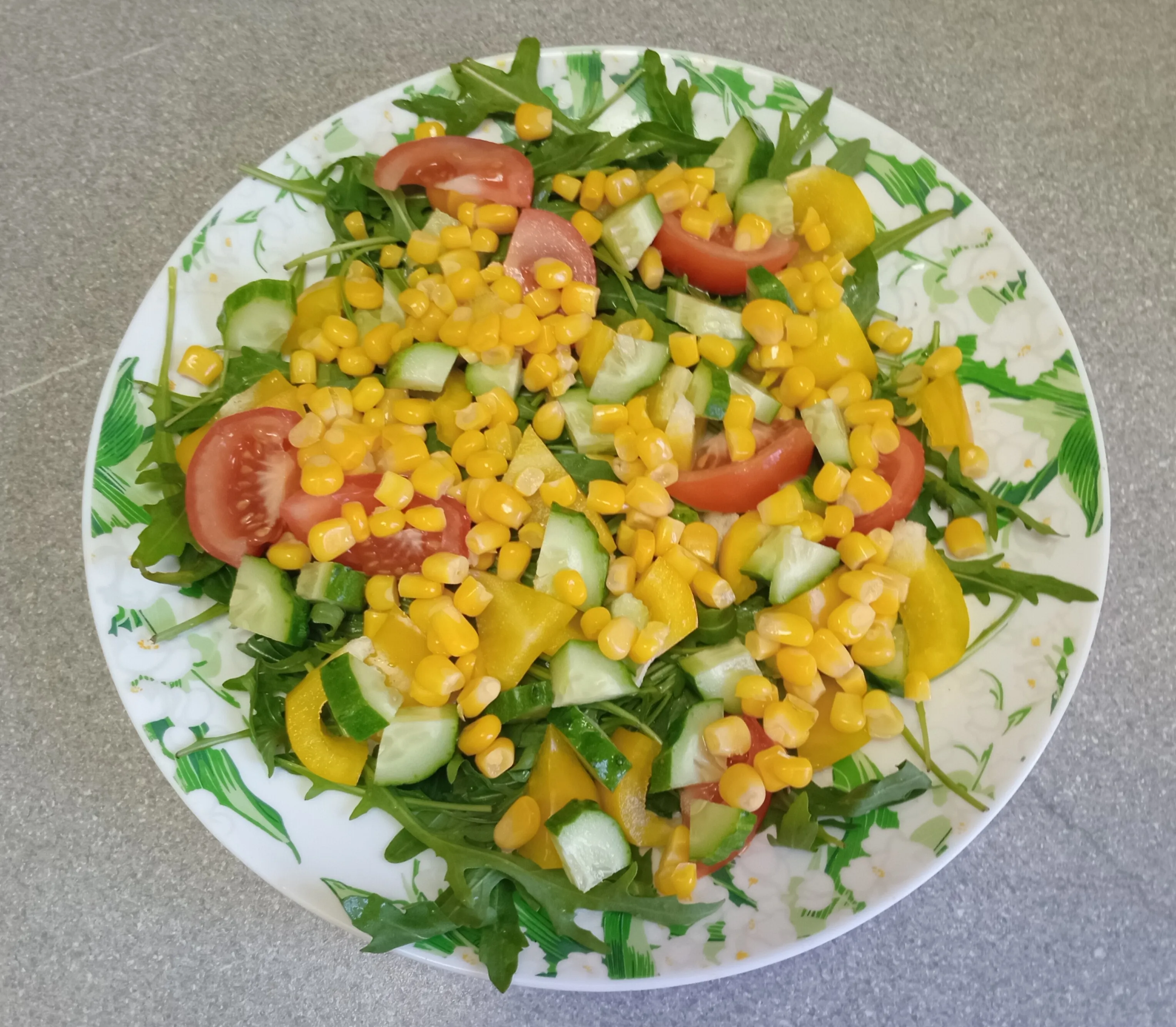 Выложите сверху нарезанный огурец, а затем консервированную кукурузу.