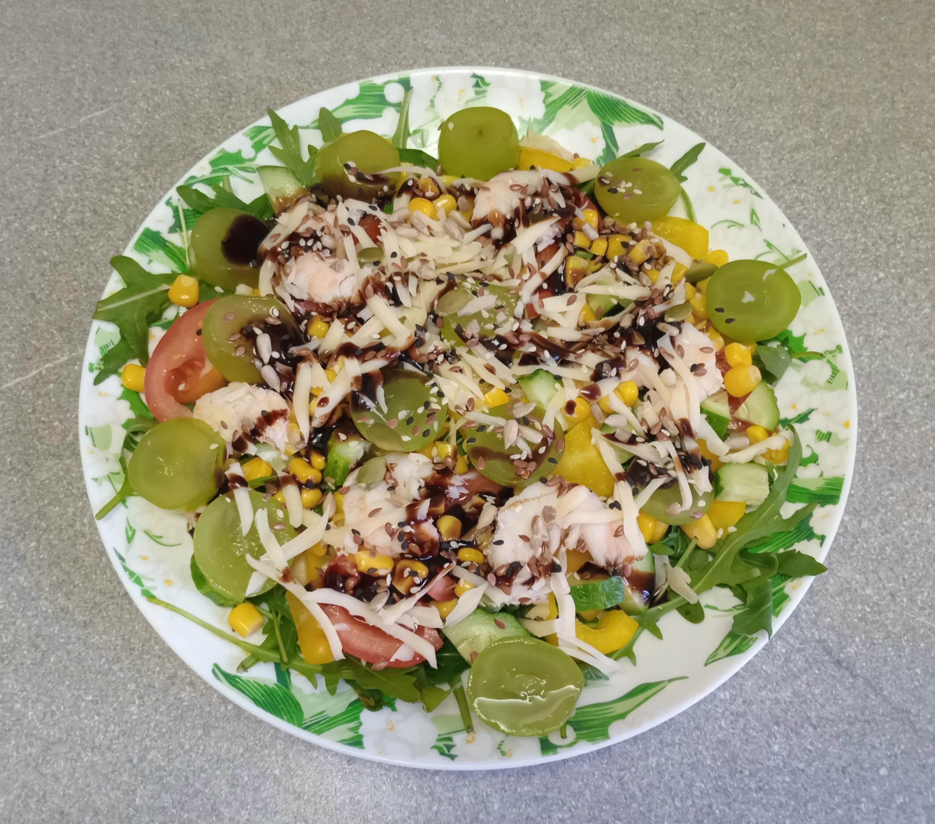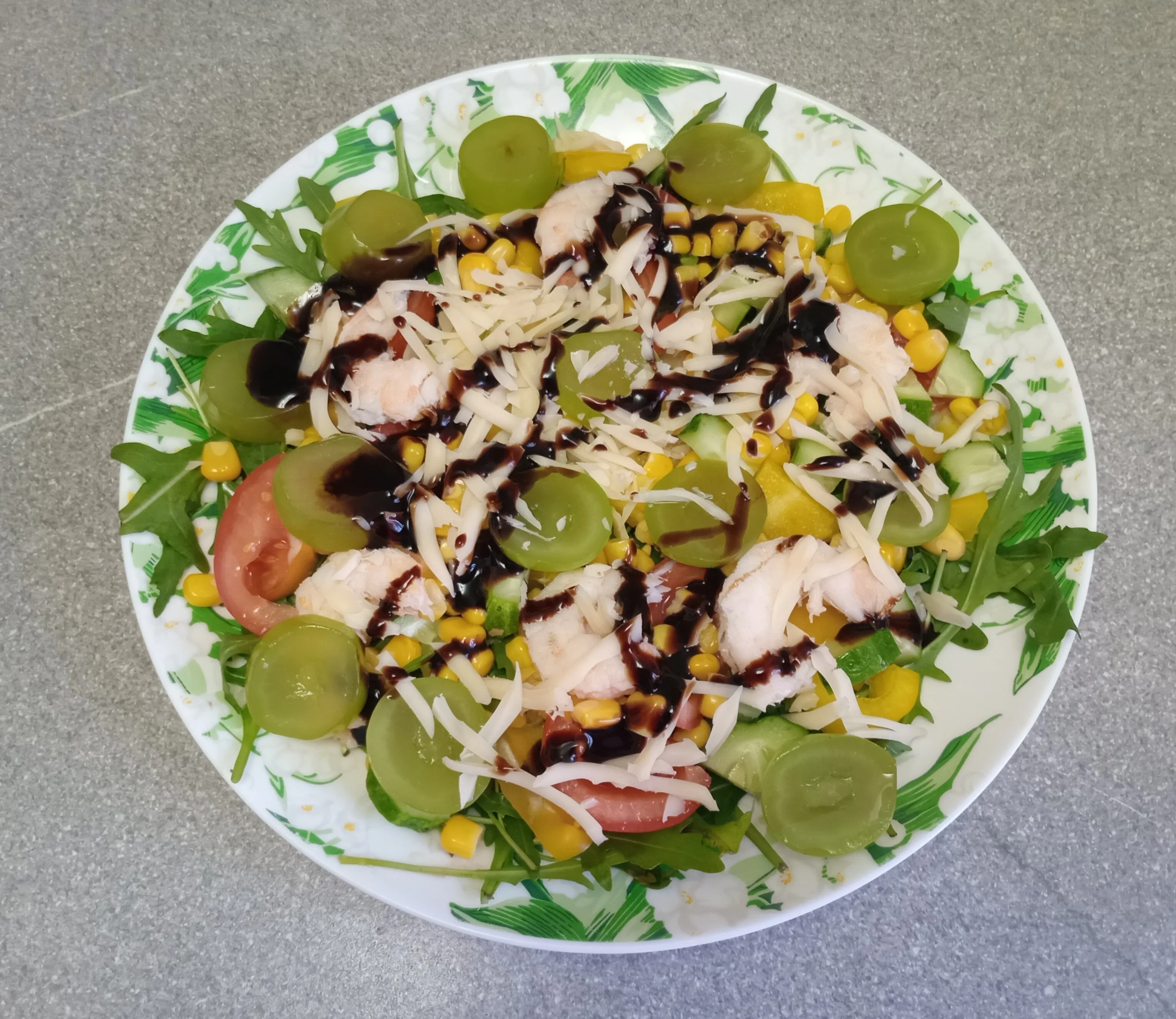Посыпьте натёртым сыром и полейте бальзамическим соусом. Подавайте к столу!