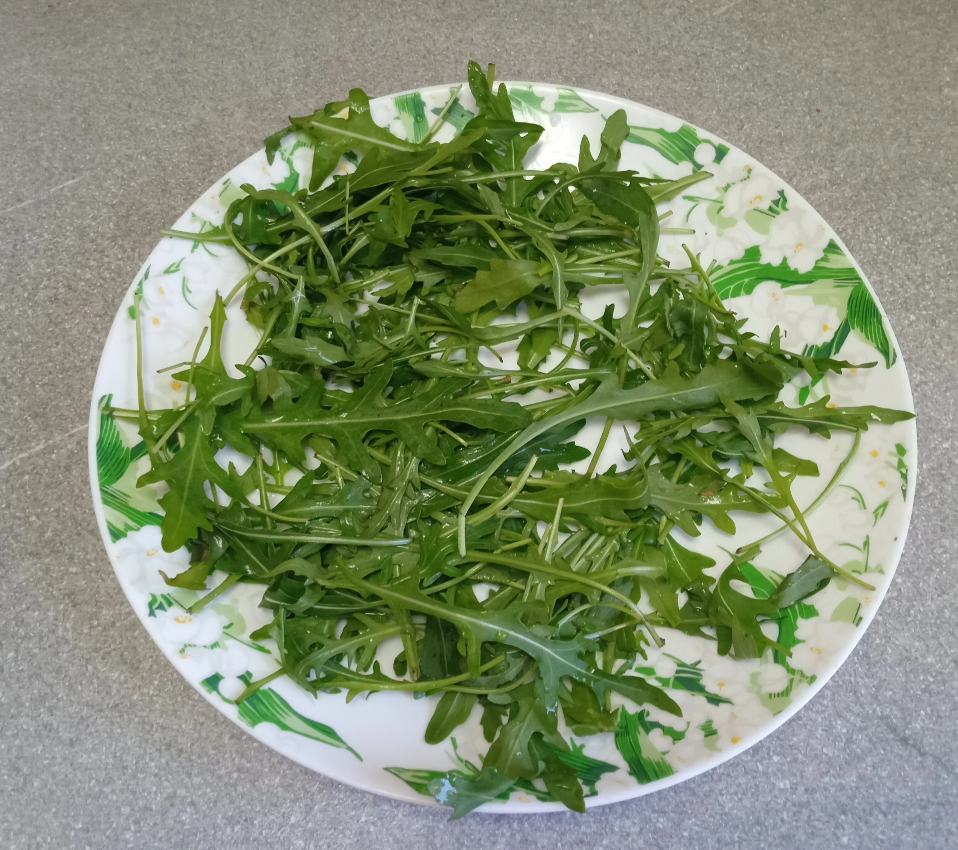 Приготовьте ингредиенты, помойте овощи. Руколу выложите на тарелку.