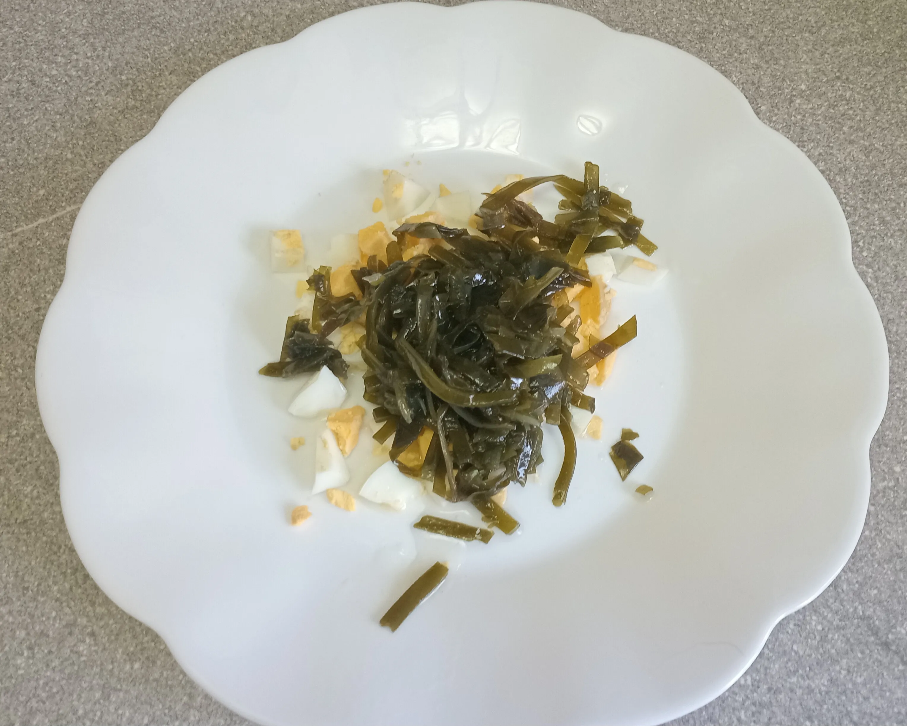 Яйцо заранее отварите в кипящей воде (10 минут). Остудите, очистите и нарежьте. Добавьте морскую капусту.