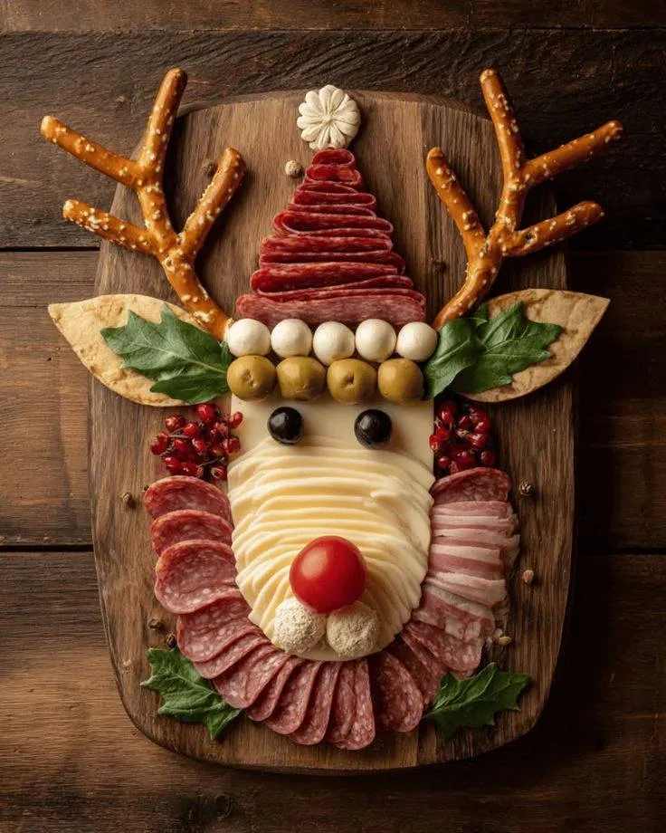 Сделайте глаза из маслин. Выложите рога из соломки и окантовку шапочки из маслин. Чипсы должны создать уши. Украсьте зеленью по желанию. Приятного аппетита!