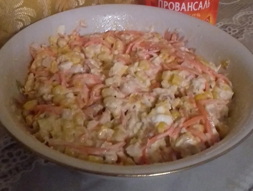 Этот салат — настоящее воплощение ярких красок и насыщенных вкусов. Сочетание пикантной корейской моркови, сладкой кукурузы и нежного яйца создаёт удивительно гармоничную композицию, которая понравится как любителям острых ощущений, так и тем, кто предпочитает более мягкие вкусы. Идеальный салат для праздника!