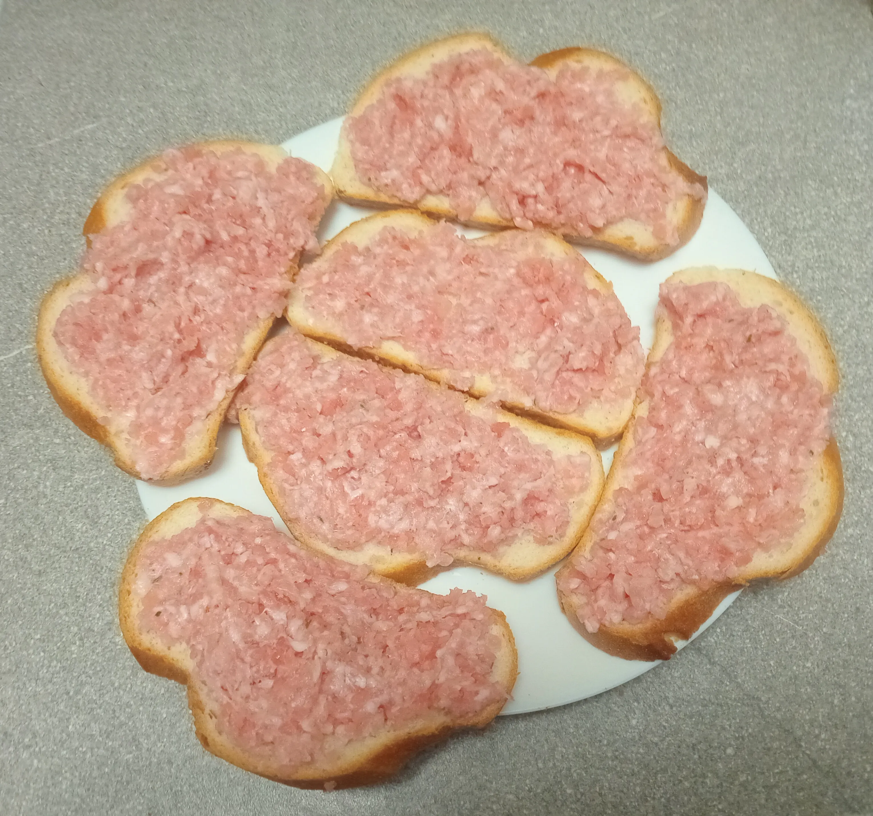 Намажьте ломтики хлеба фаршем. Выровняйте. Разогрейте духовку до 180°C.