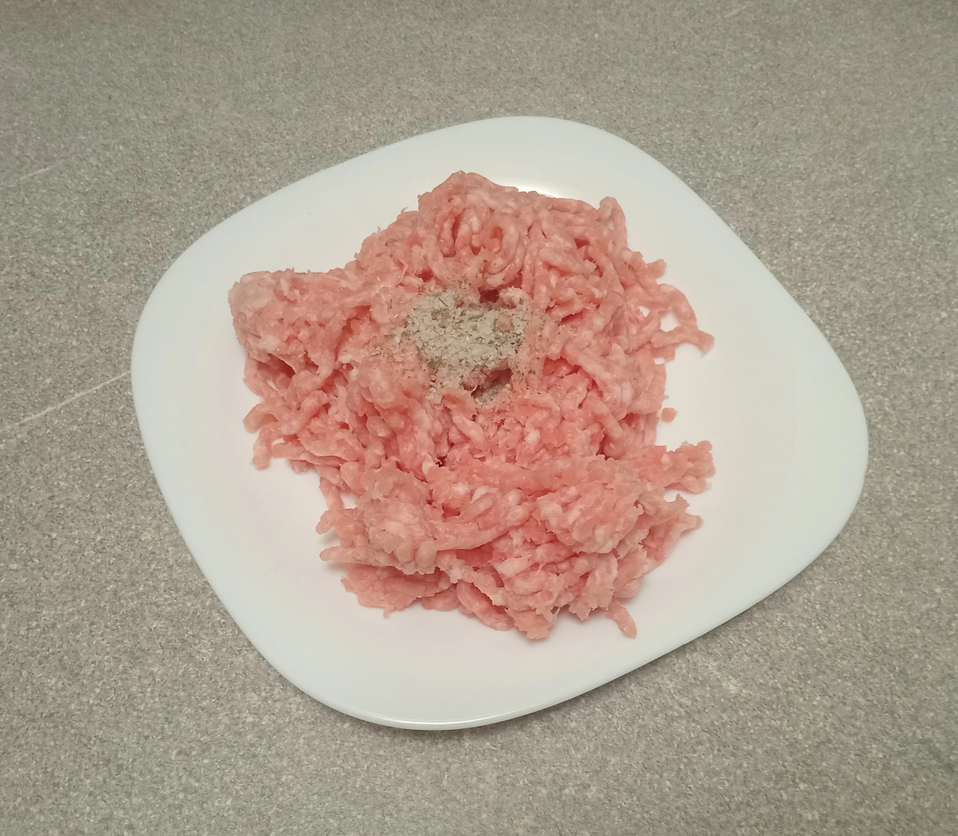 Мясной фарш смешайте с адыгейской солью. Перемешайте очень тщательно. Нарежьте хлеб на ломтики или возьмите нарезку.