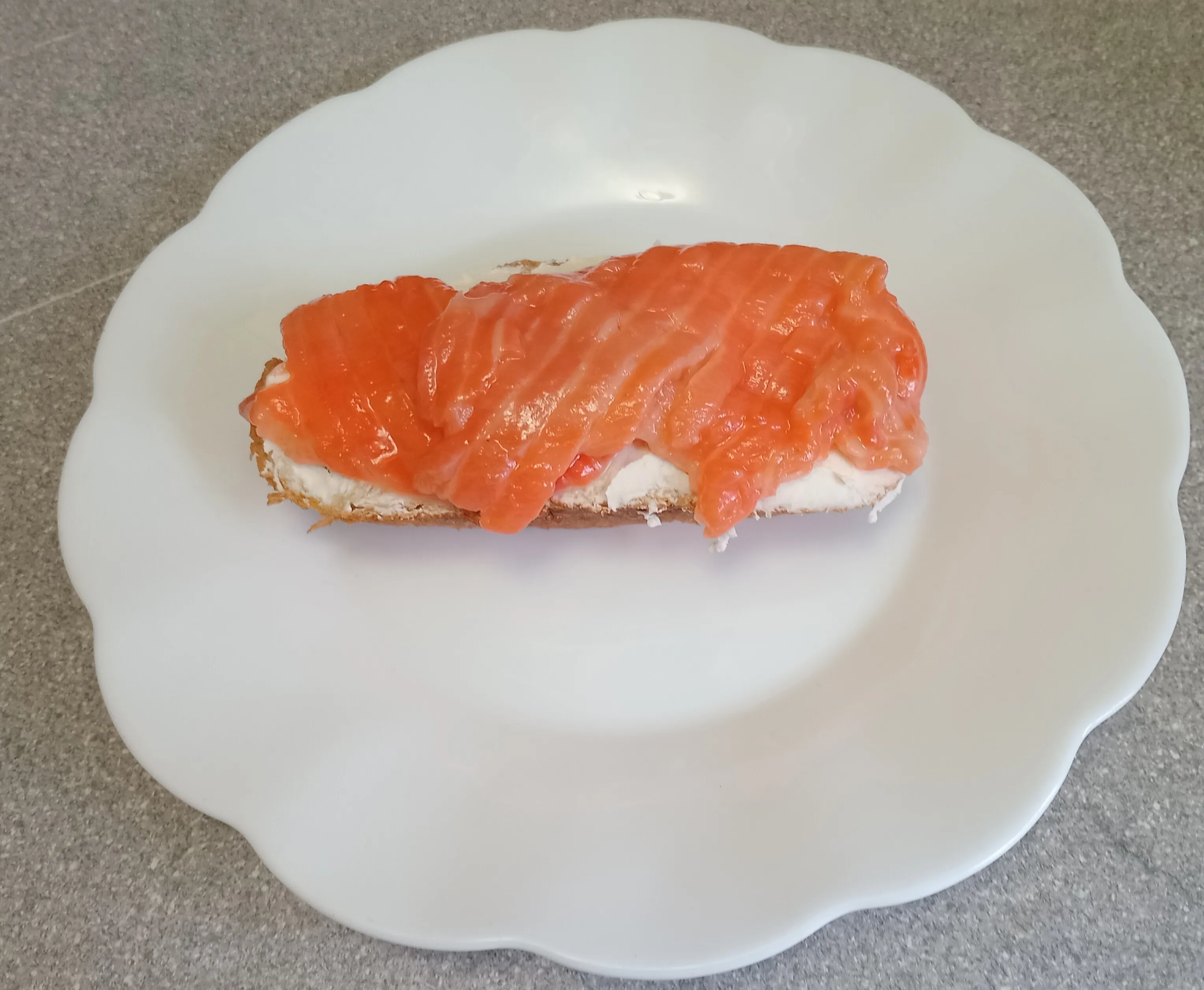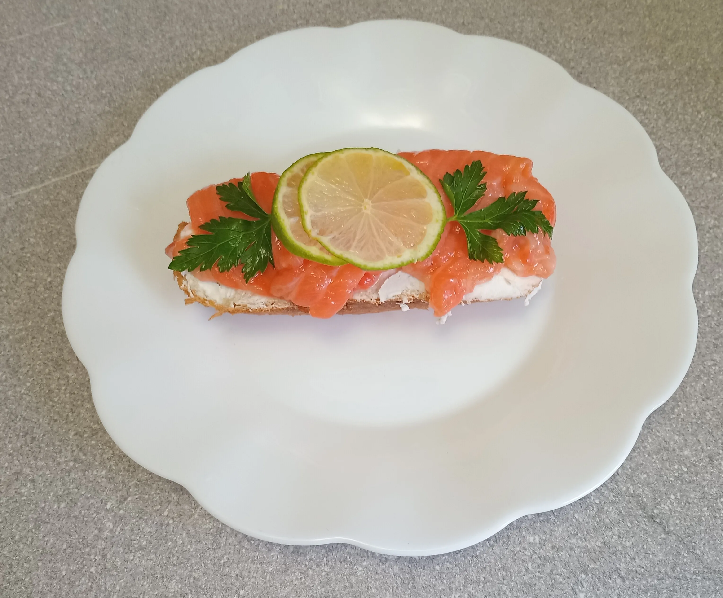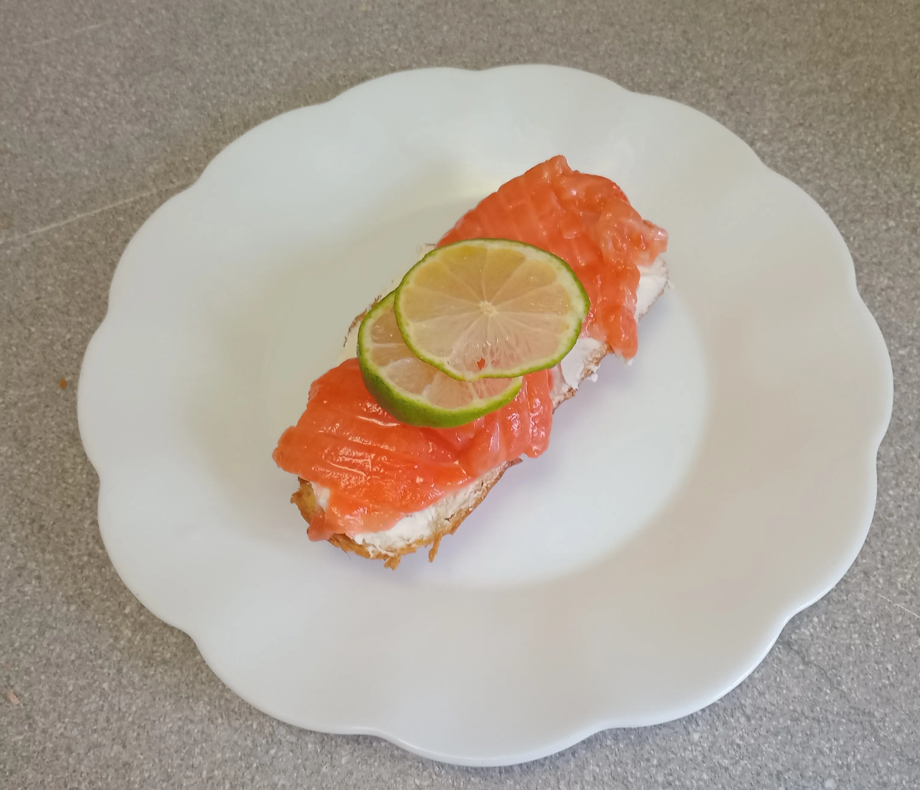 Помойте и нарежьте лайм. Выложите сверху на бутерброд тонкие ломтики лайма.