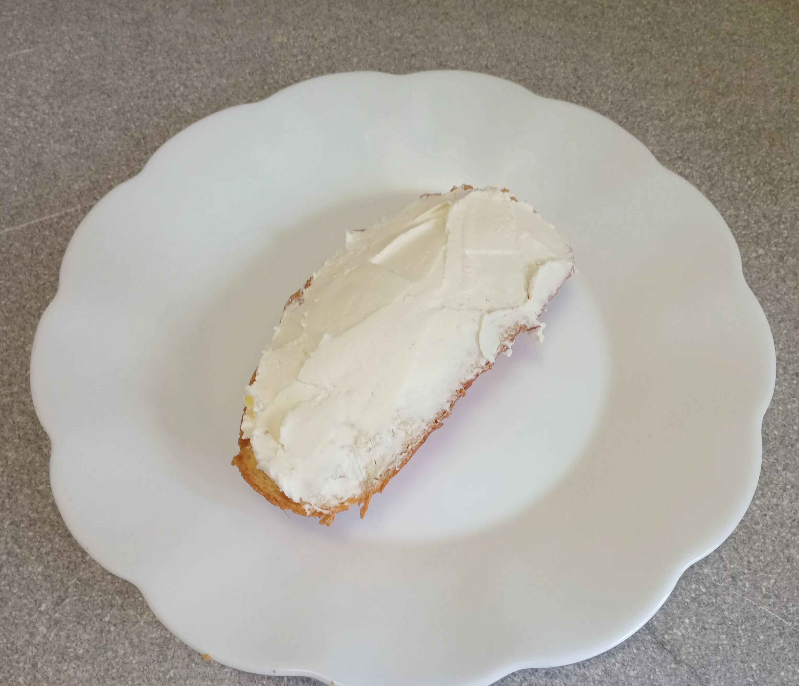 На ломтики нарезного батона намажьте творожный сыр. Слой должен быть плотный.