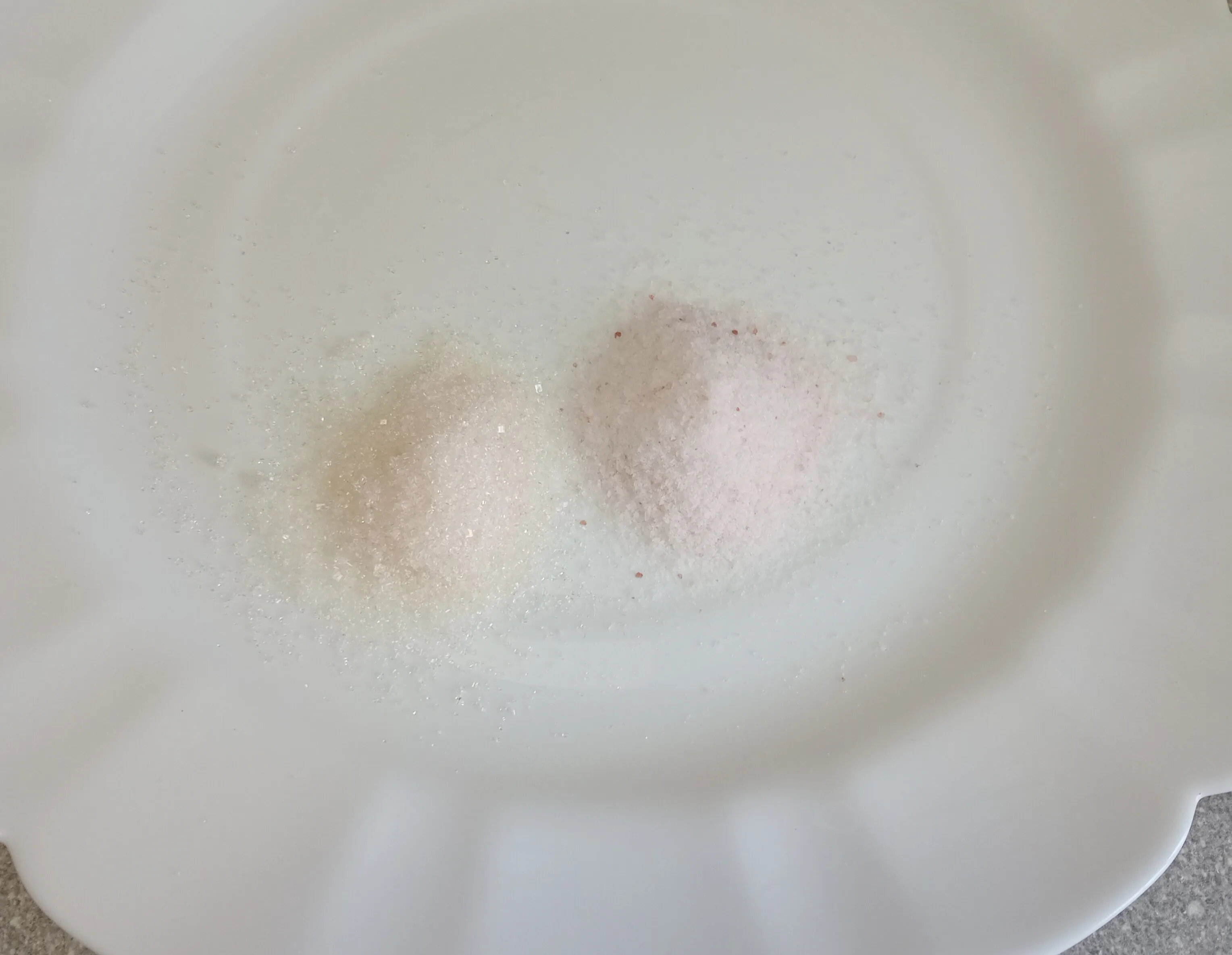 Смешайте сахар и гималайскую соль (можно заменить обычной).