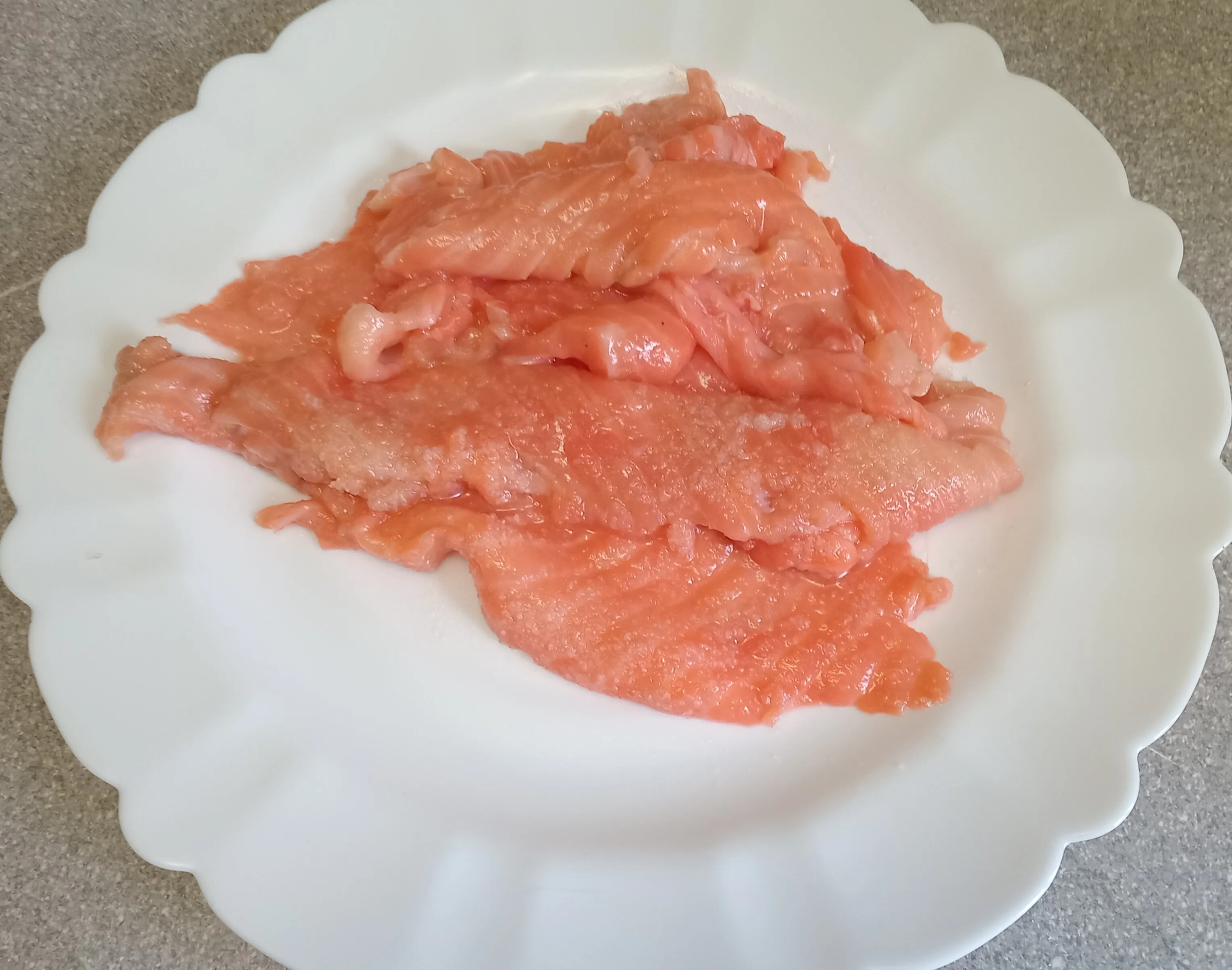 Обваляйте кусочки форели в получившейся смеси. Оставьте в холодильнике на три часа.