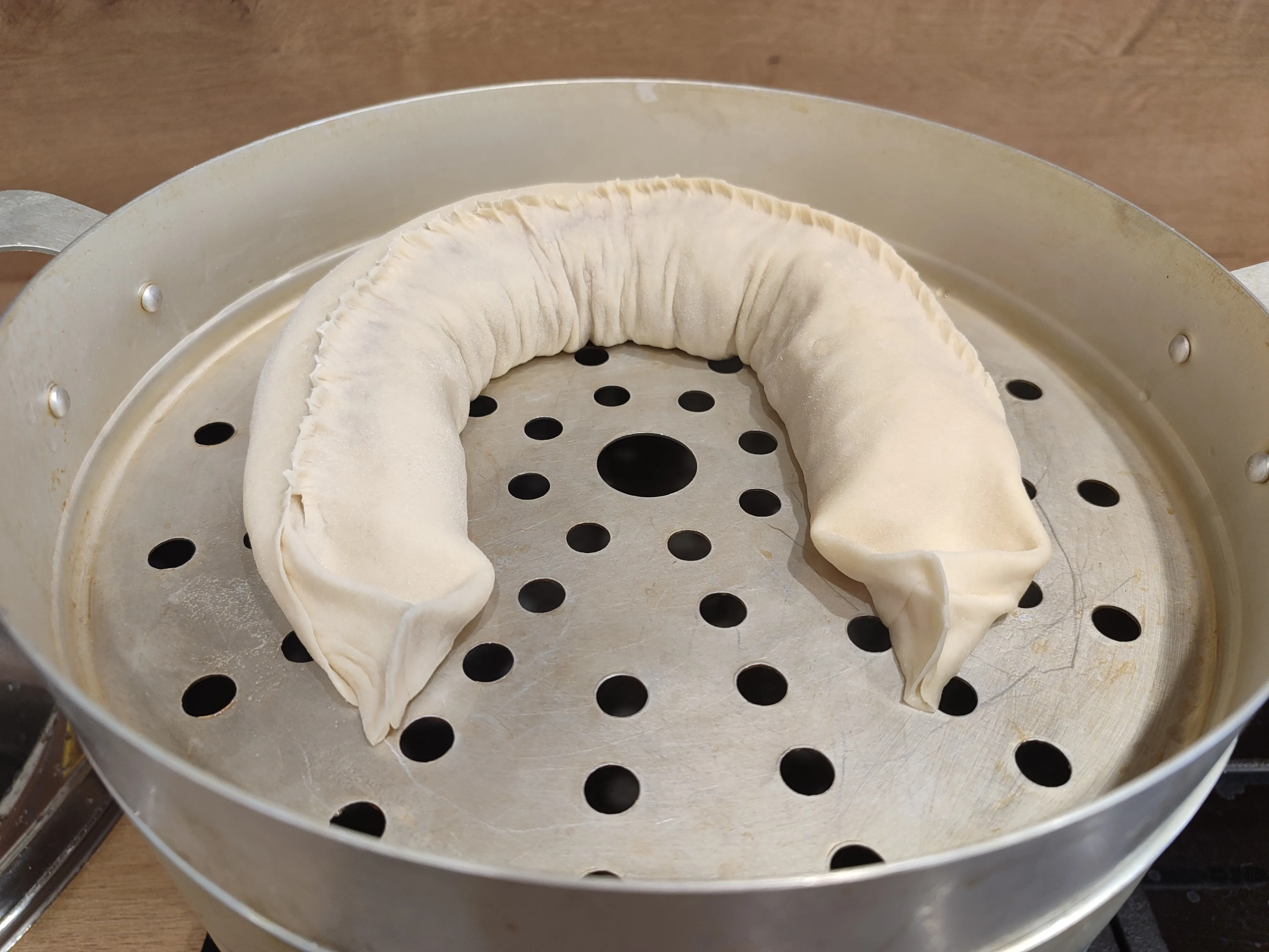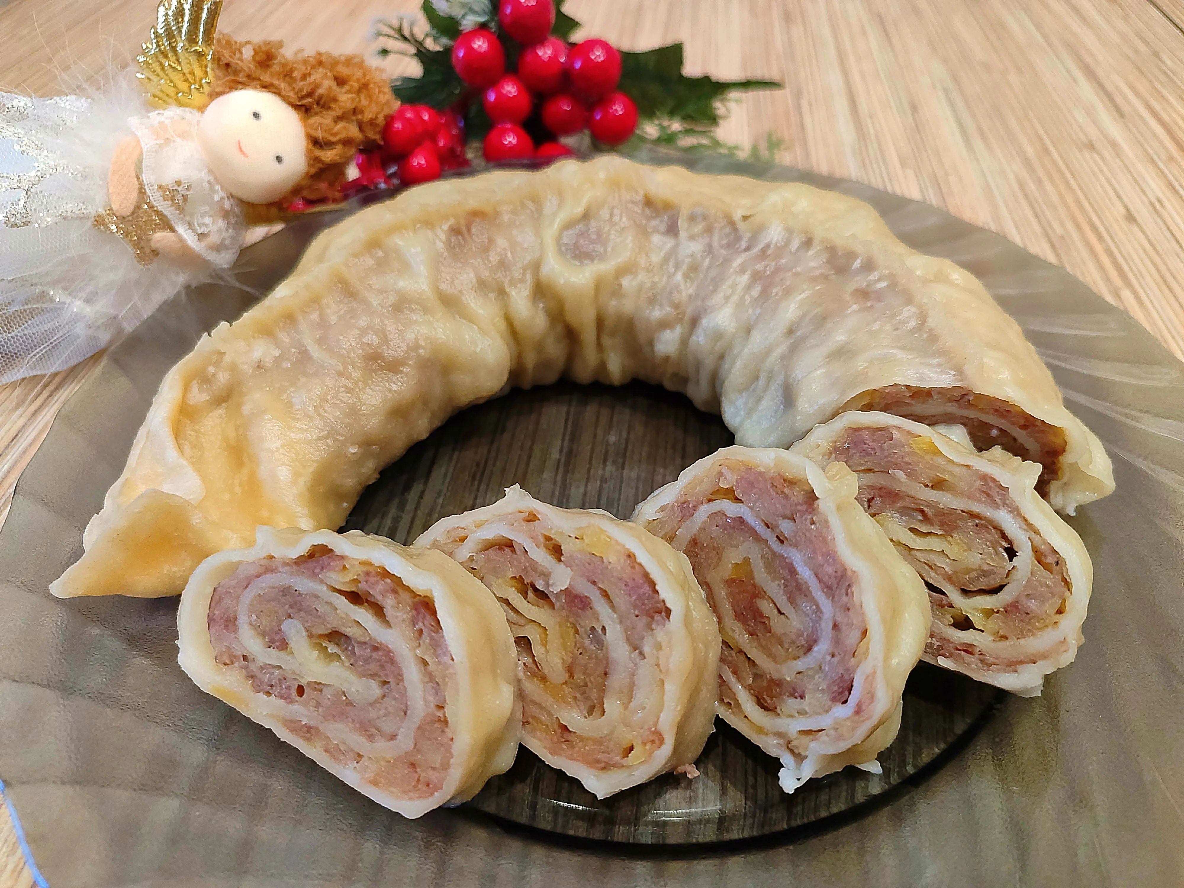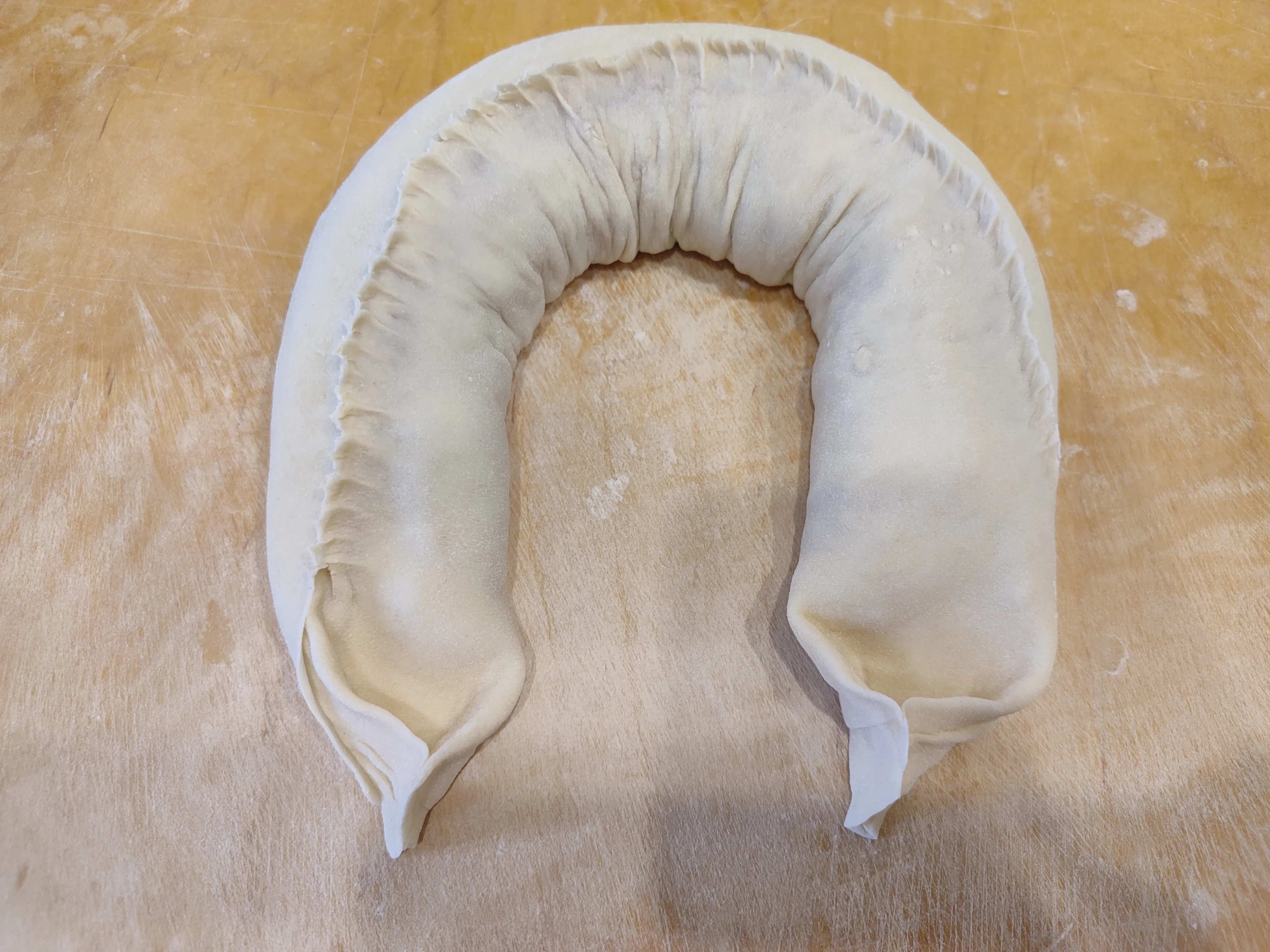 Заверните тесто с начинкой в рулет. Придайте заготовке форму подковы. Края теста можно защипнуть любым способом.
