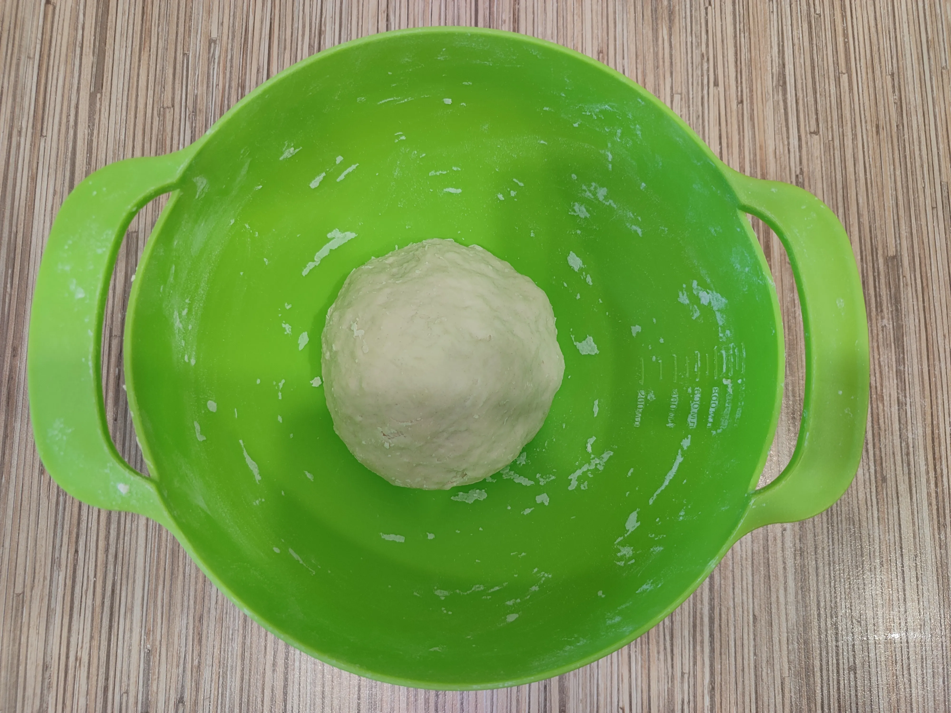 Приготовьте тесто. В тёплую воду добавьте 4 щепотки соли и пшеничной муки. Замесите эластичное тесто. Отложите в сторонку на 15 минут, накрыв полотенцем.