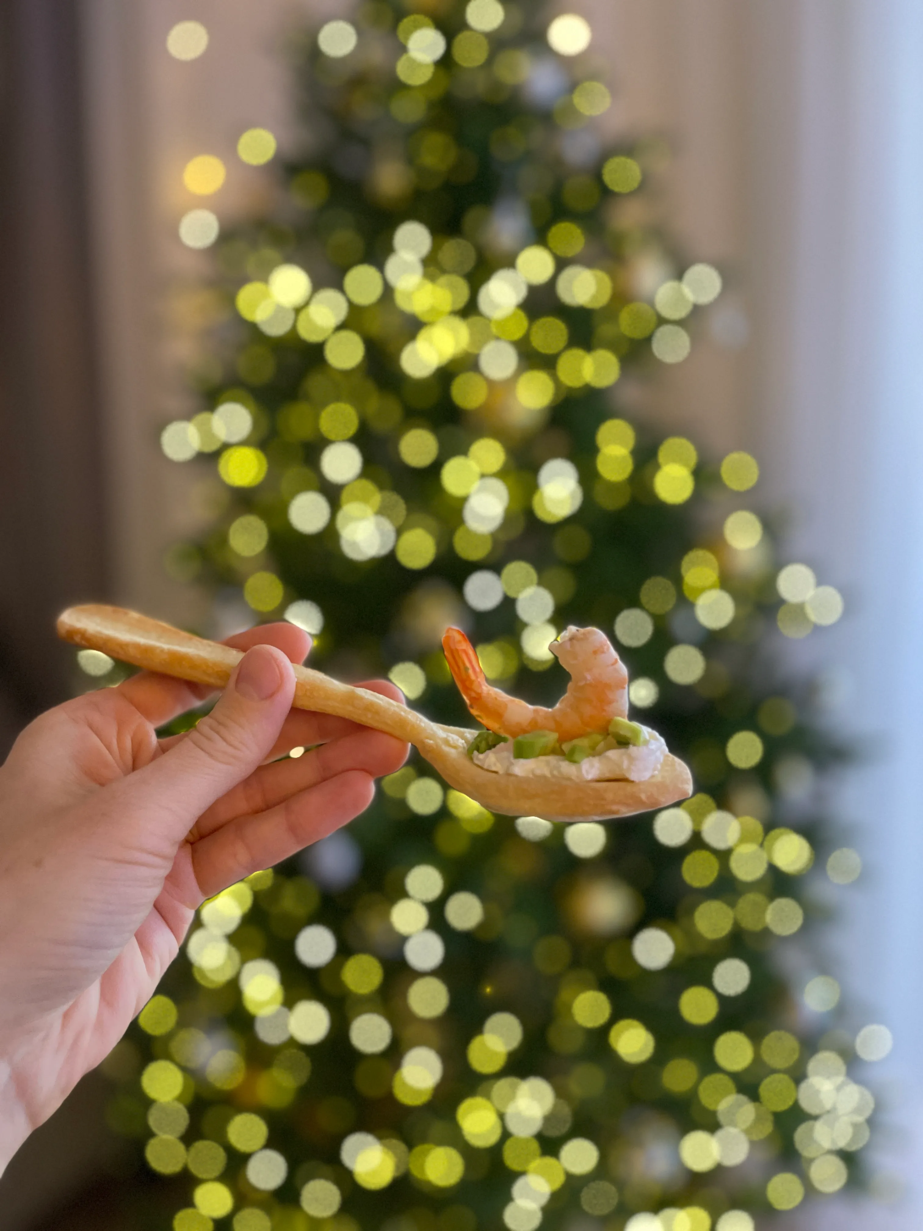 Когда ложки испекутся, аккуратно снимите их с форм. Выложите начинку на ложки из теста и сверху положите креветки. Закуска готова!