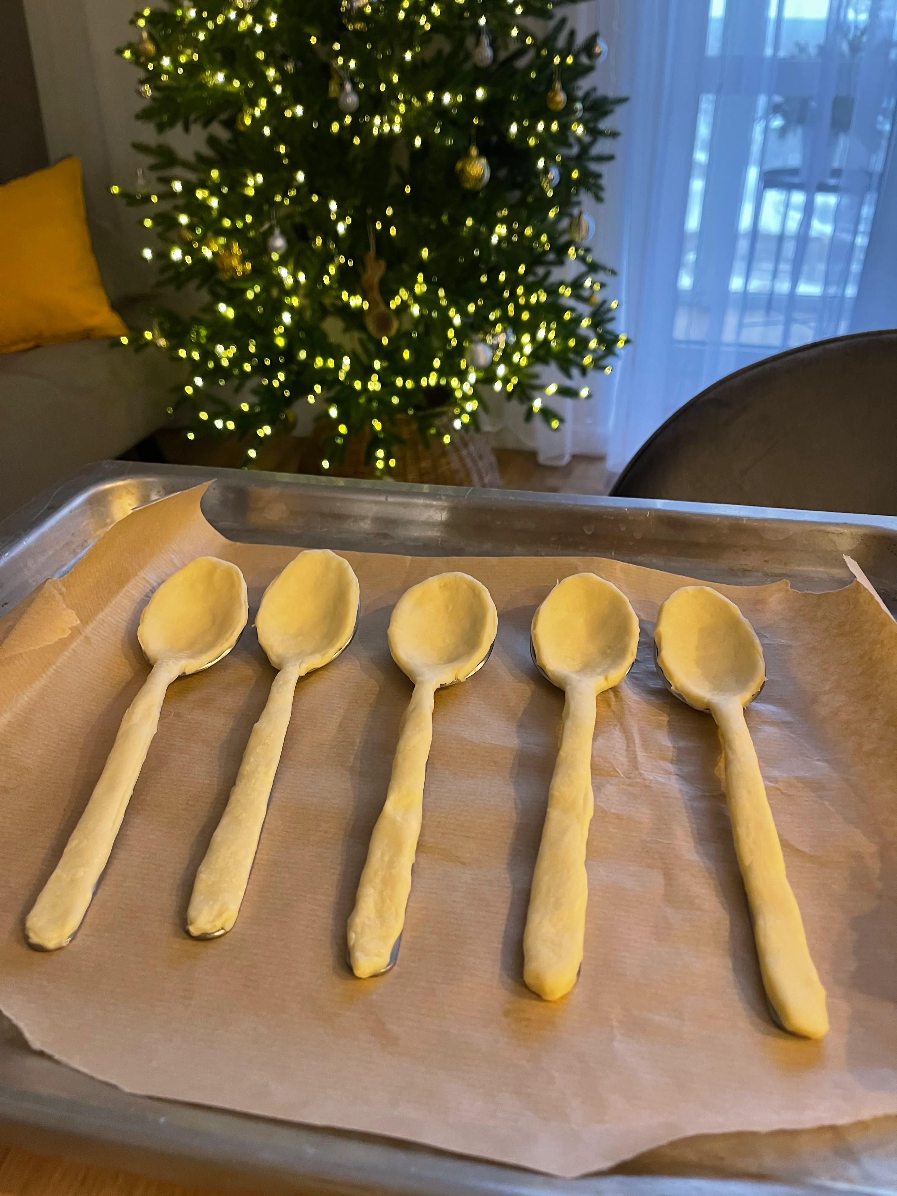 Раскатайте тесто, возьмите обычные столовые ложки и используйте их в качестве формы: положите поверх теста и аккуратно обведите их, вырежьте из теста ложки. Тем временем включите духовку разогреваться на 180°C.