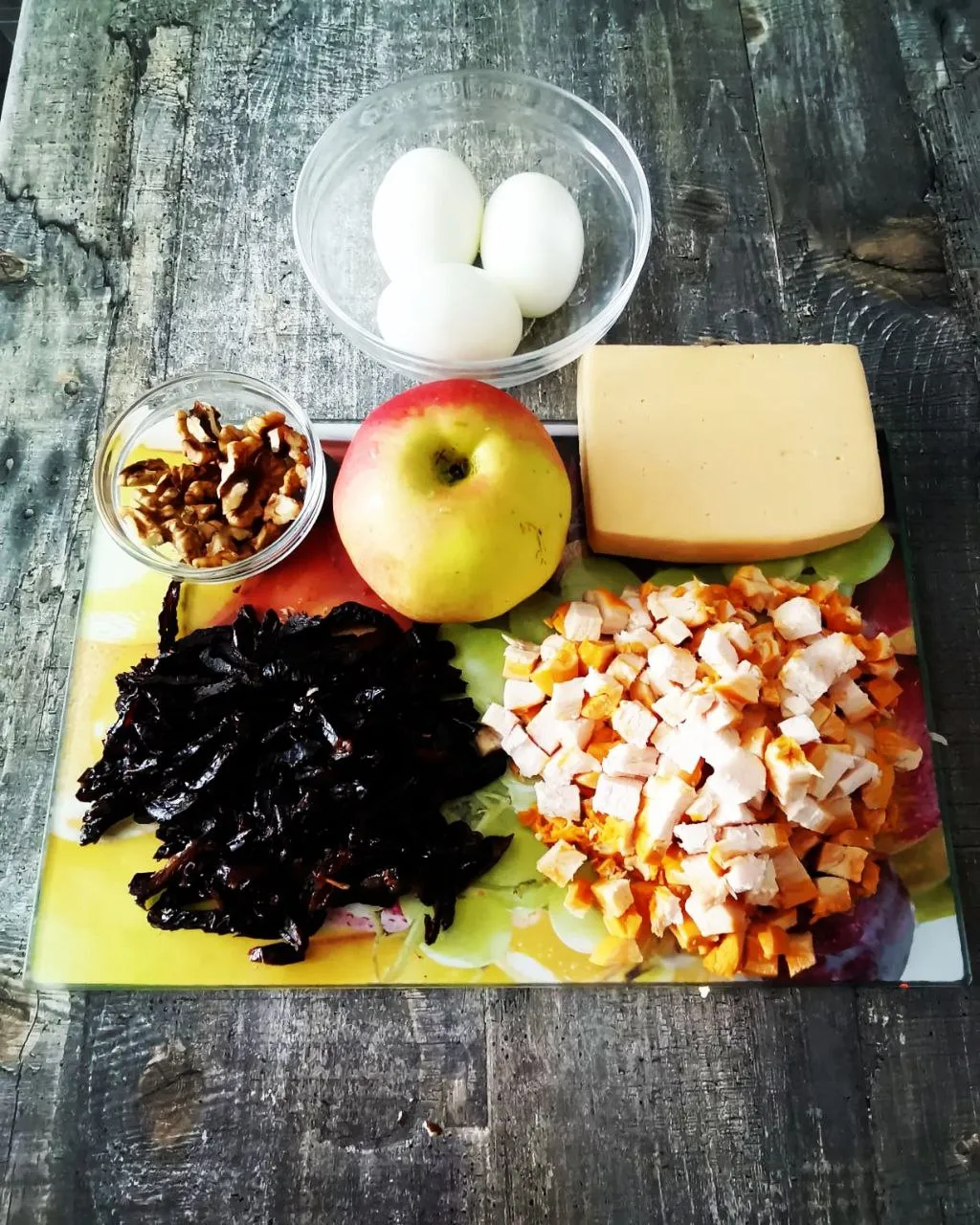 Приготовьте все ингредиенты для салата. Отварите яйца вкрутую, остудите, натрите на тёрки белки и желтки по отдельности. Сыр натрите на тёрке. Яблоко, чернослив и орехи помойте. Орехи измельчите. Яблоко натрите на тёрке. Чернослив нарежьте полосками. Нарежьте куриное филе.