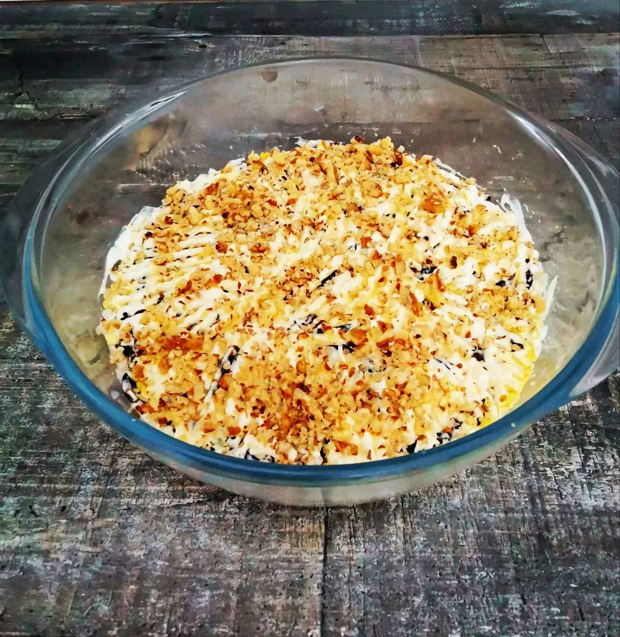 Сверху посыпьте салат измельчёнными грецкими орехами. Приятного аппетита!