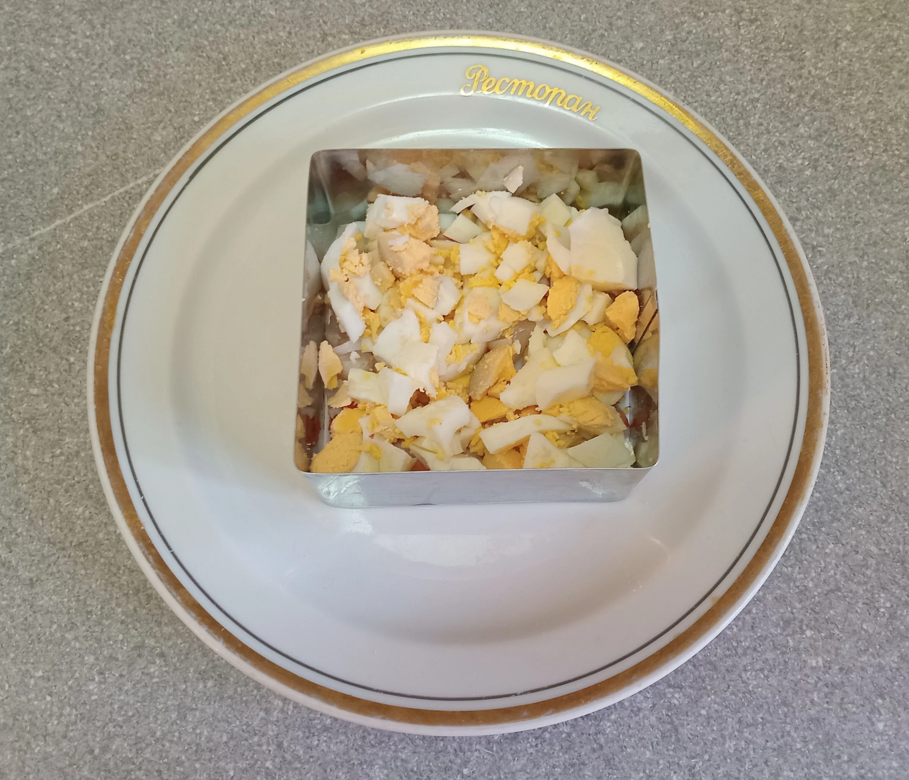 Яйцо отварите десять минут в кипящей воде. Очистите, нарежьте кубиками и выложите на краба. Смажьте майонезом.