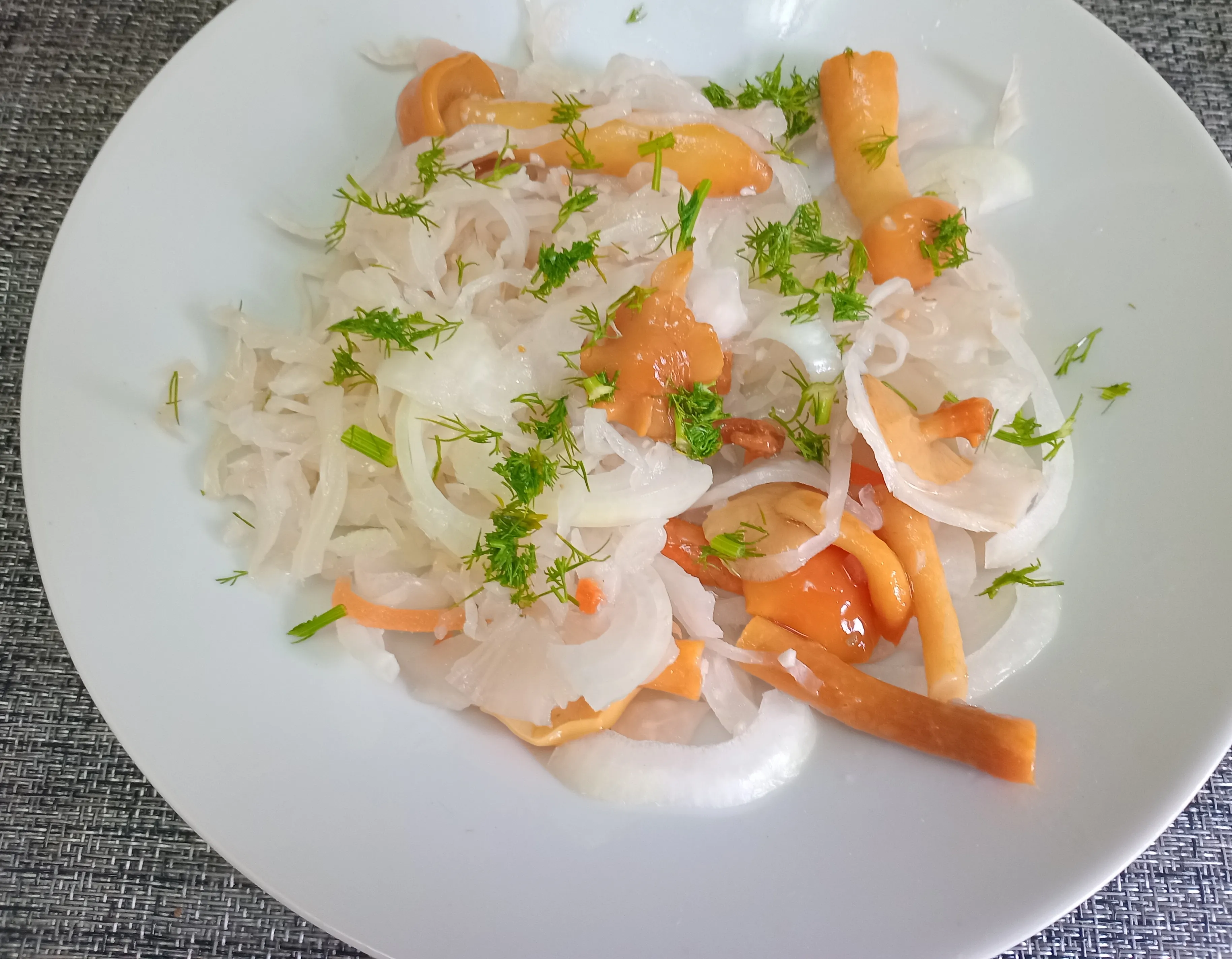 Репчатый лук нарежьте полукольцами. Добавьте в салат квашеную капусту.