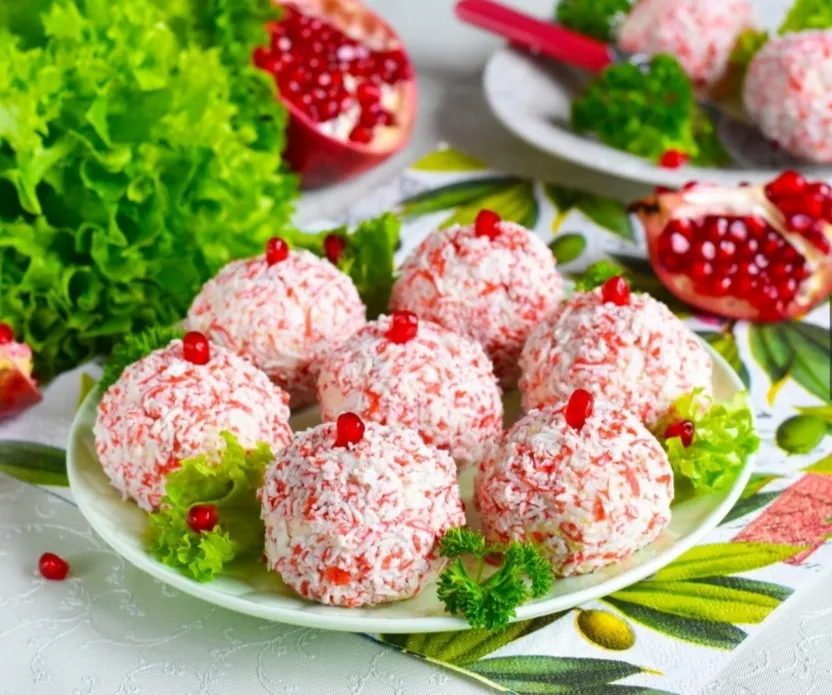 Слепите шарики, обсыпьте натёртыми крабовыми палочками. Украсьте гранатом, грецким орехом и зеленью. Угощение готово.