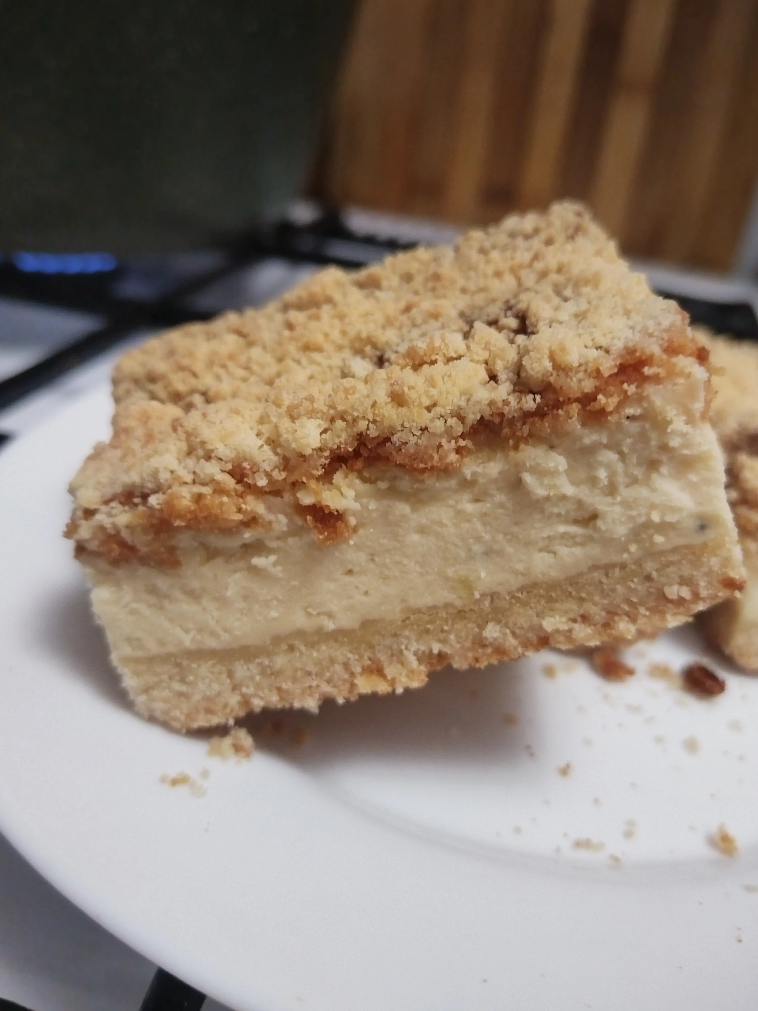 Выложите начинку в противень на слой теста, сверху начинки высыпьте оставшееся тесто в виде крошки.