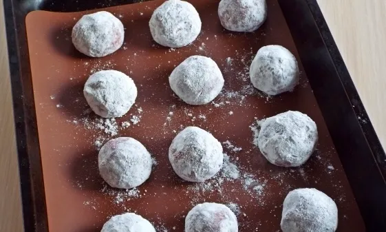 Скатайте шарики из теста размером с грецкий орех. Каждый шарик щедро обваляйте в сахарной пудре и выложите на противень с ковриком или бумагой. Выпекайте печенье при температуре 180°C 12 минут.