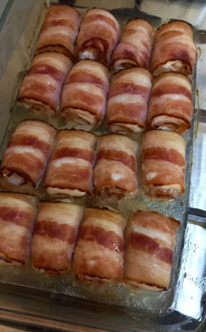 Отправьте в разогретую до 180°C духовку минимум на 30 минут (зависит от размера получившихся рулетиков и мощности духовки). Бекон будет отдавать много жира, поэтому смазывать маслом форму для запекания не нужно.