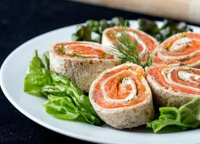 Выложите кусочки на блюдо, украсьте веточками укропа и лимонными дольками. Подавайте охлаждённым как закусочный рулет или дополнение к праздничному столу.