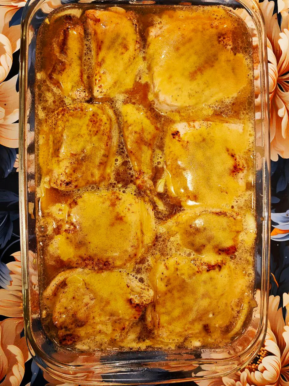 Выложите обжаренные кусочки мяса, залейте пивом. Смешайте: масло растительное, мёд, лимон, горчицу, хлопья острого перца. Смажьте мясо.