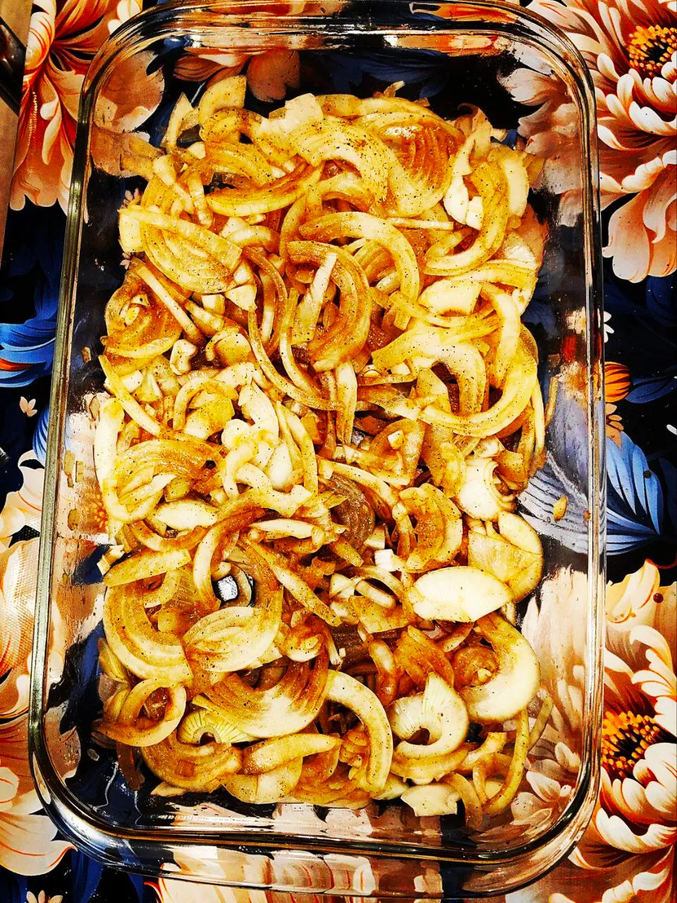 Лук очистите, нарежьте полукольцами, выложите в глубокую форму для запекания. Добавьте чёрный перец, соль, соевый соус. Перемешайте, выровняйте по форме