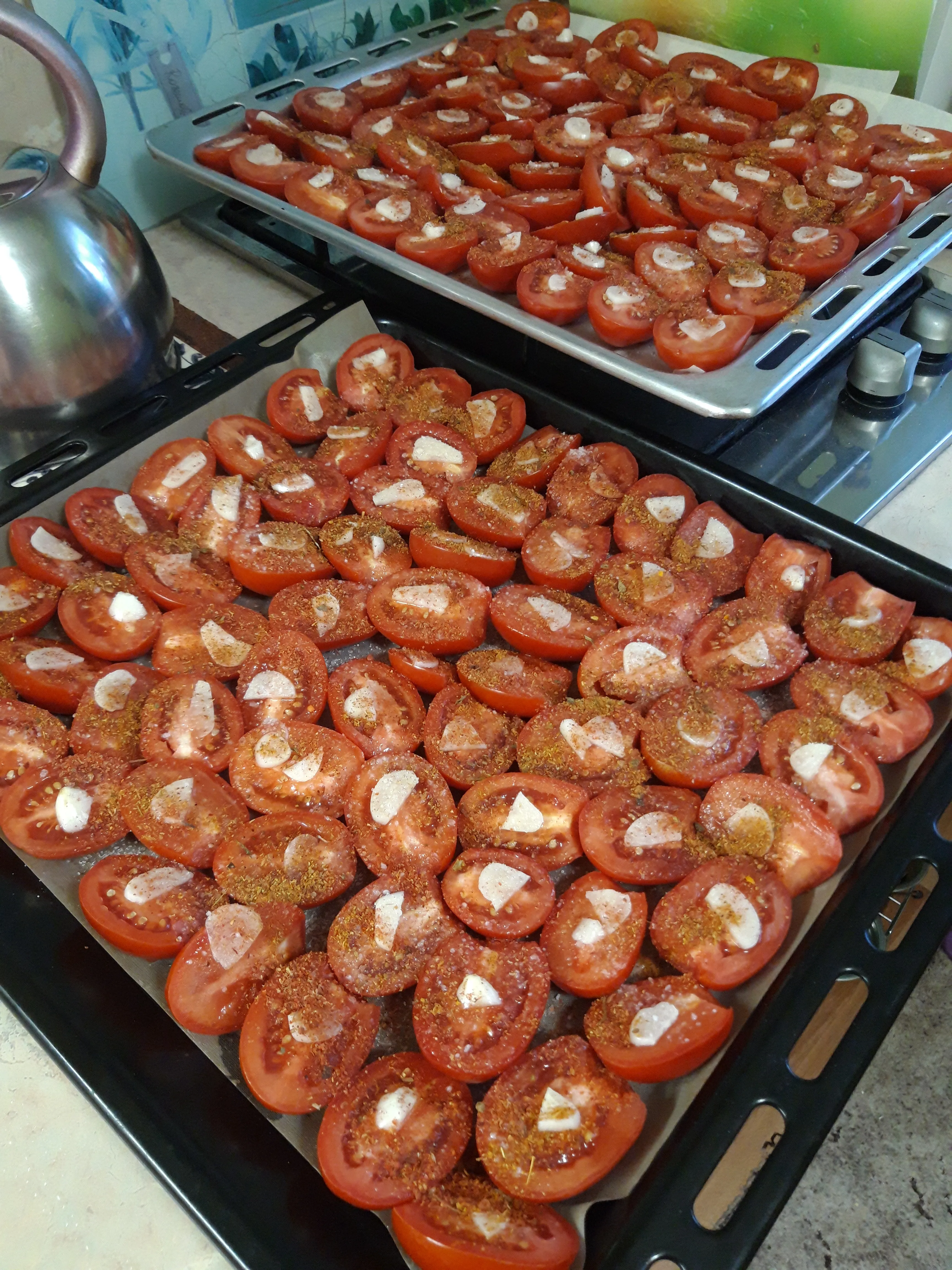 На противень постелите бумагу для запекания. Каждый помидор разрежьте пополам. Чеснок порежьте тонкими пластинками и выложите на каждую половинку помидора. Посыпьте специями, солью и сахаром. Сбрызните оливковым маслом.