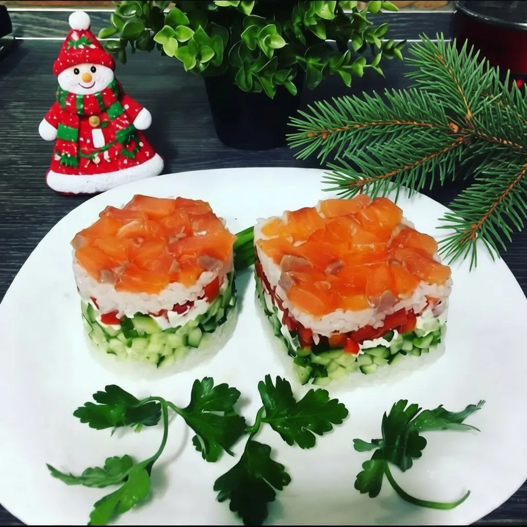 Это слоёный салат, сочетающий в себе элементы японской кухни. Оригинально и вкусно!