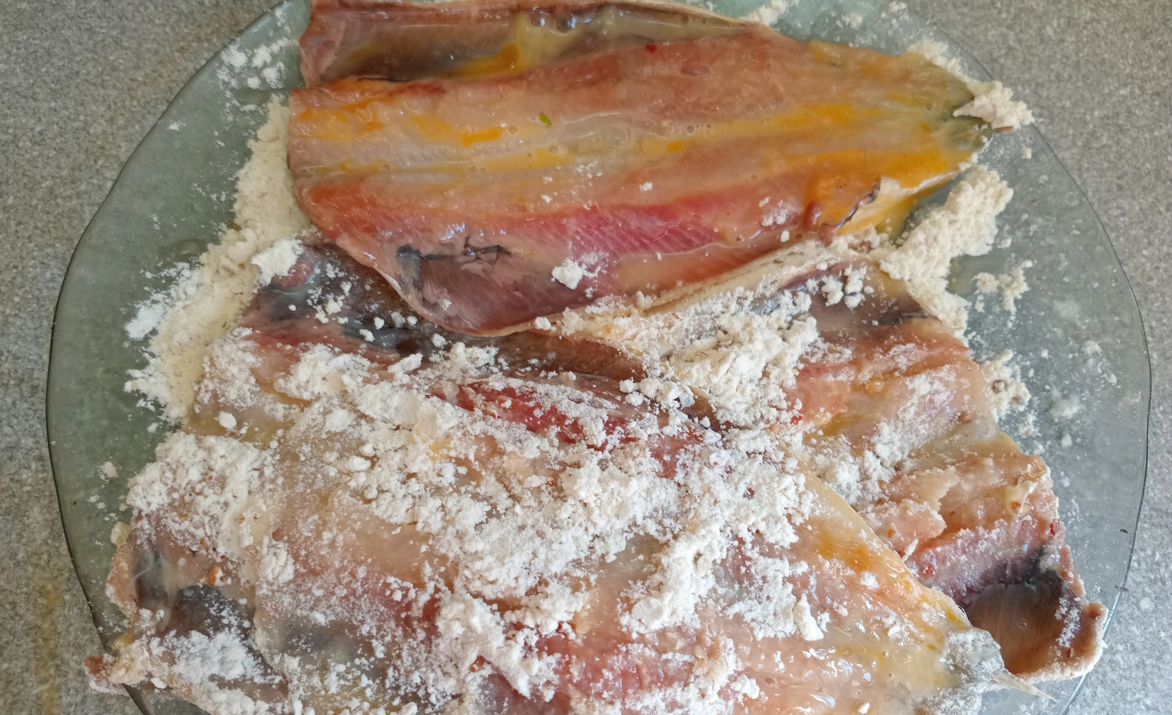 Смешайте муку с солью. Обваляйте в муке рыбу.