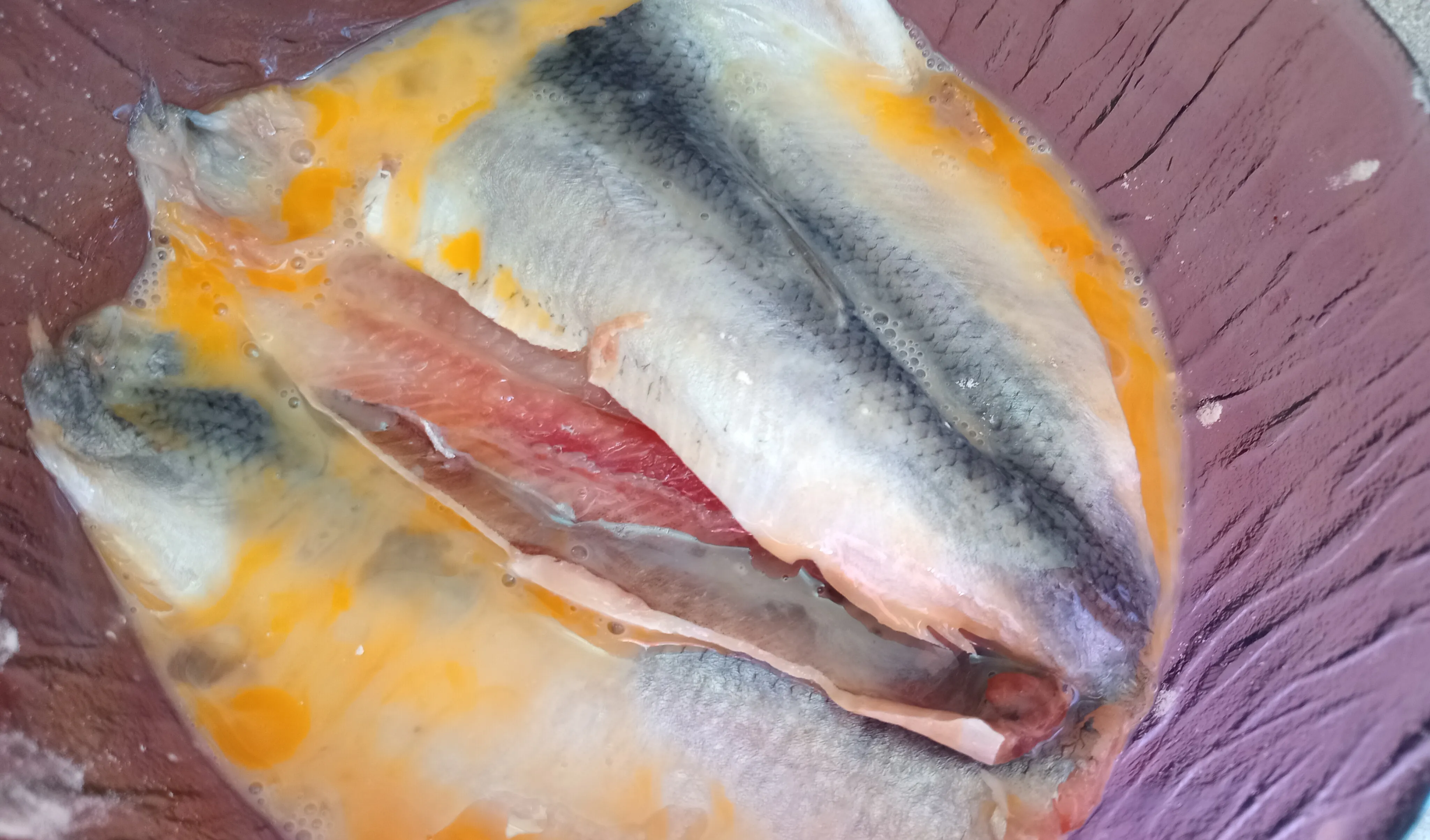 У рыбы удалите голову, внутренности и плавники. Разрежьте салаку и удалите позвоночную кость. Обваляйте в яйце.