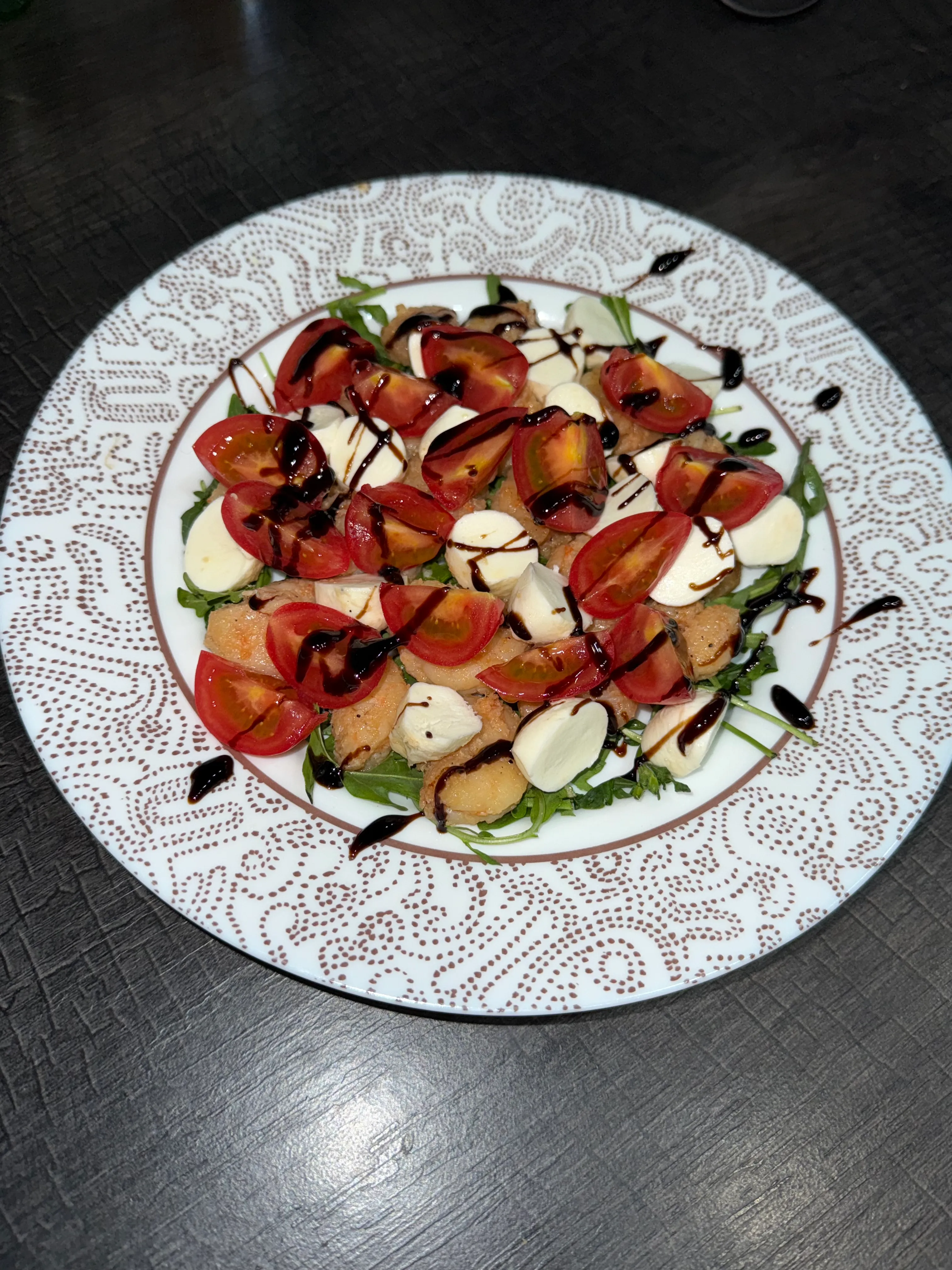 На тарелку выложите зелень, сверху сыр Моцарелла, затем креветки, помидоры черри. Полейте всё бальзамическим соусом.